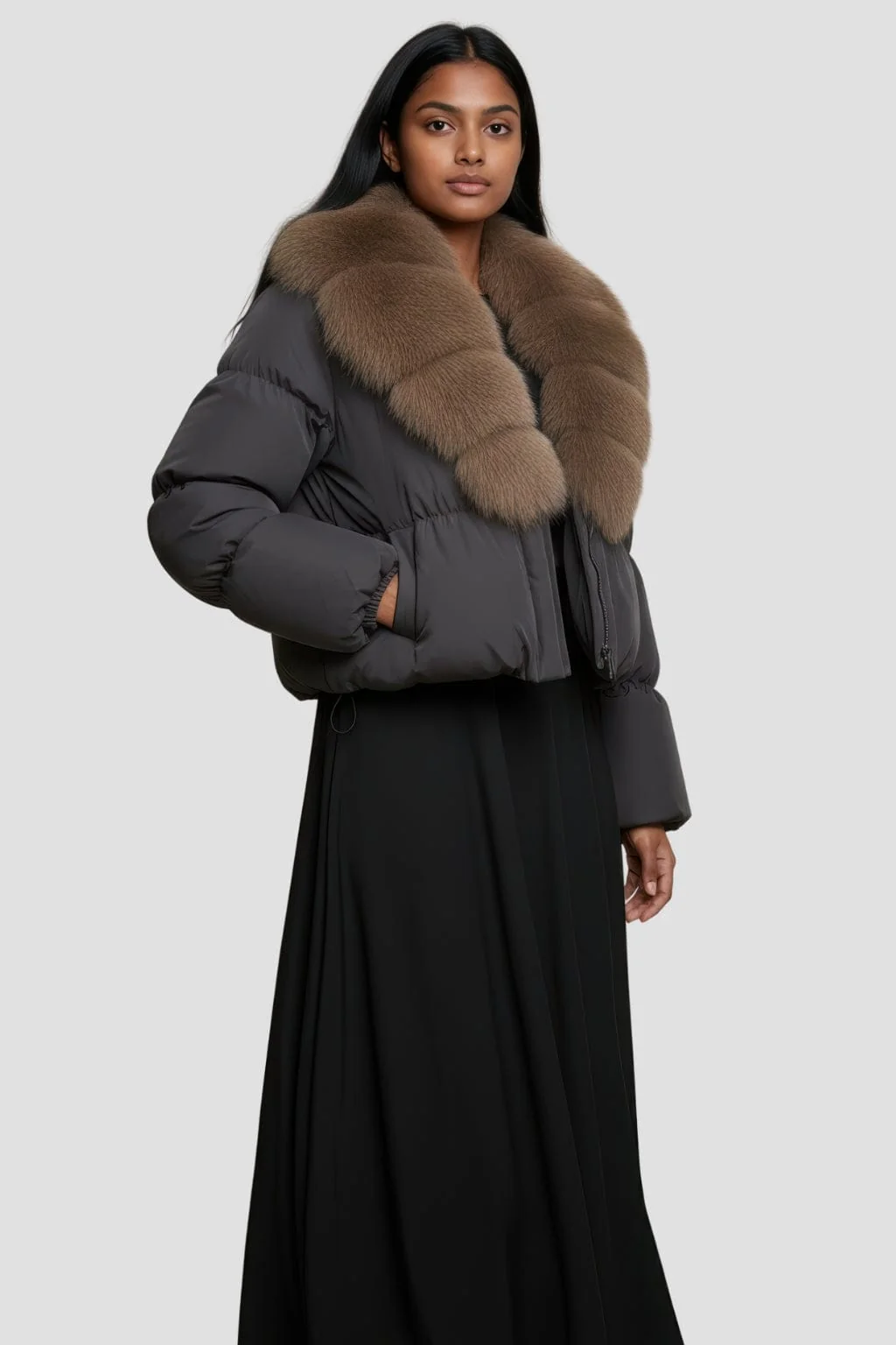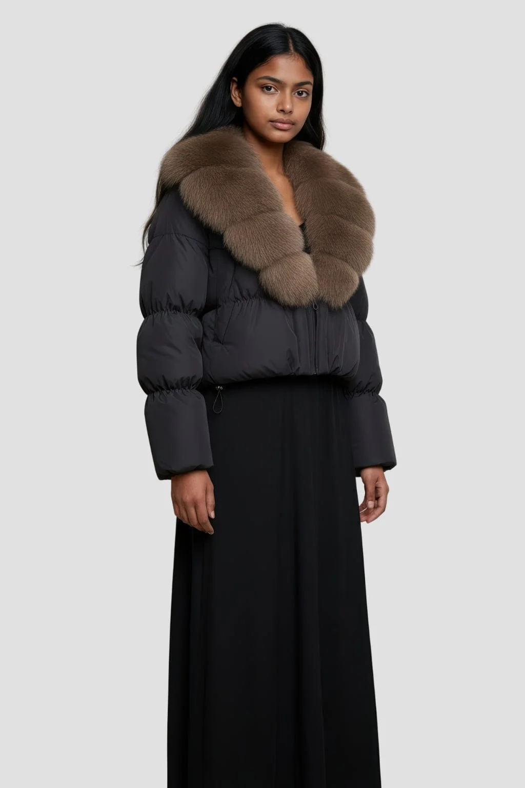 Entre contrastes profonds et allure posée, le blouson en fourrure renard à col marron affirme un chic assuré. La ligne, sereine et précise, met la silhouette en valeur sans ostentation.