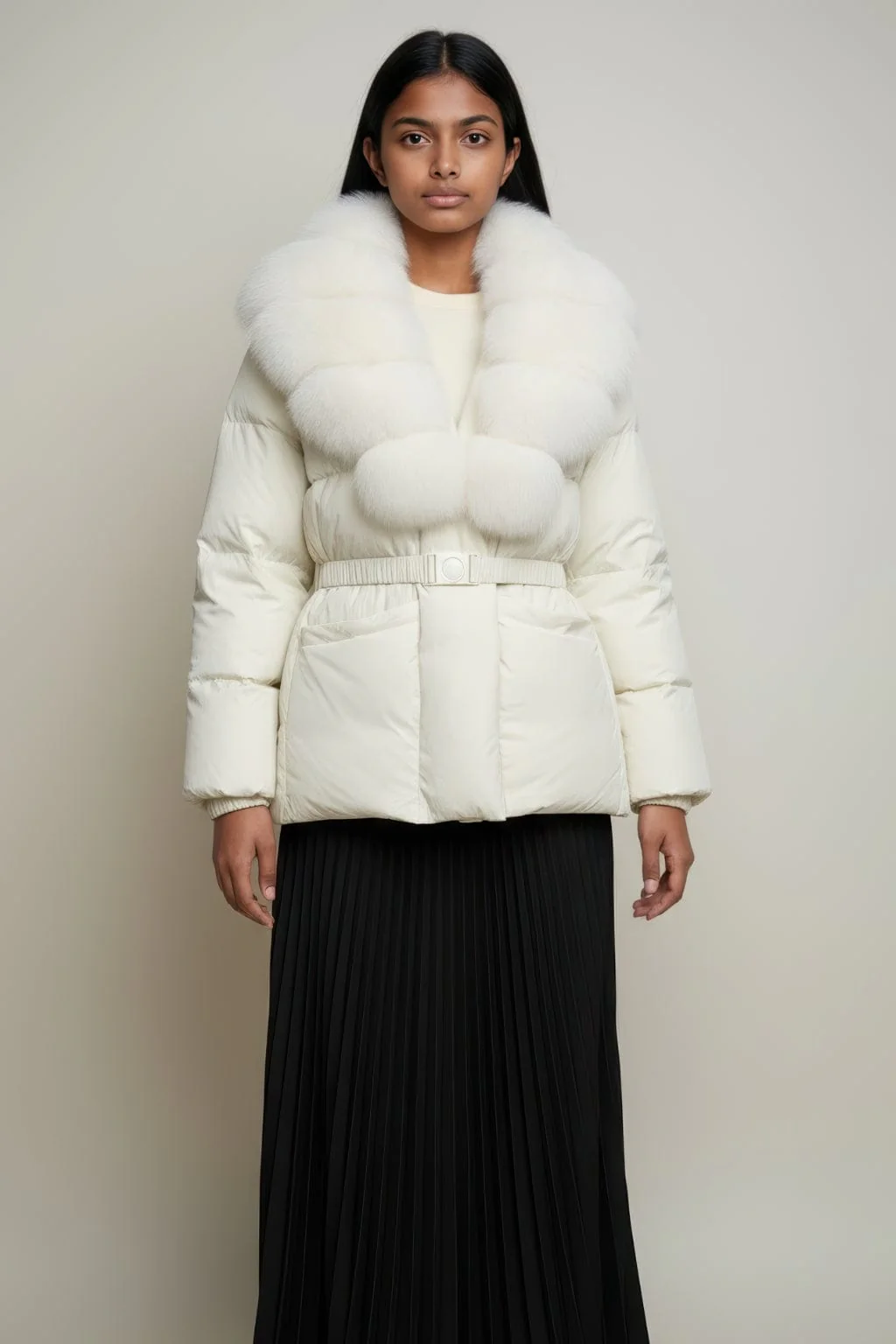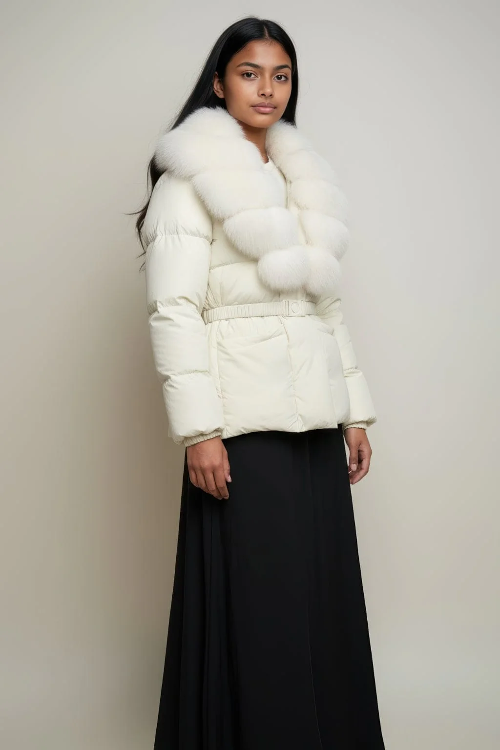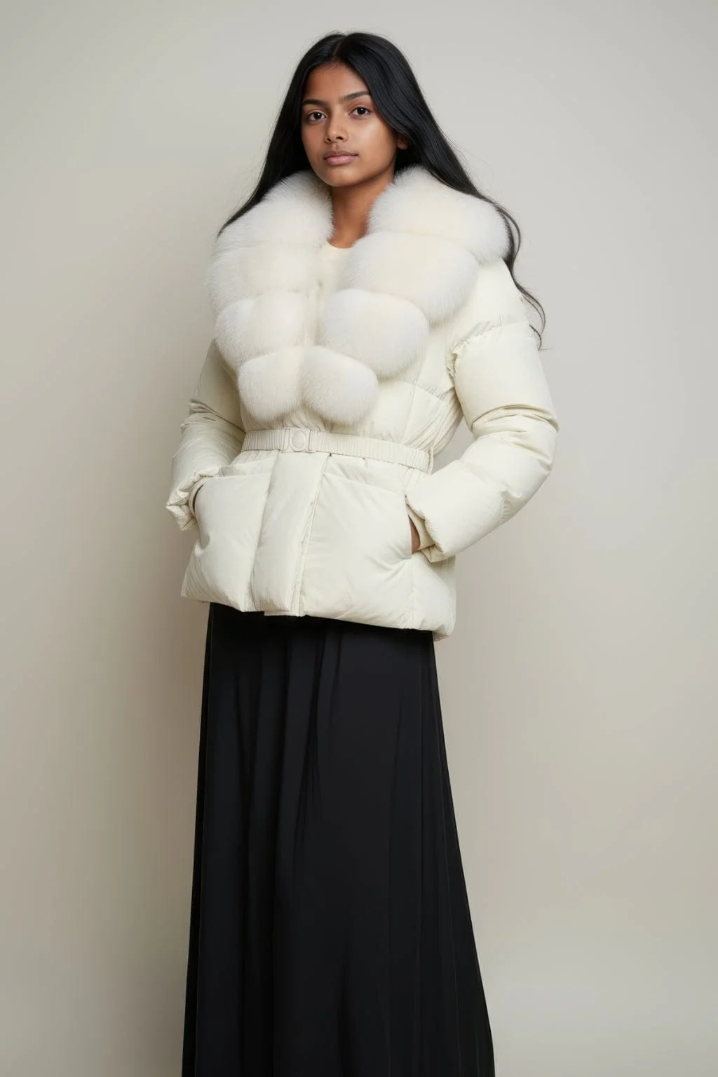 Le blouson fourrure femme mi long beige concentre un chic apaisé
