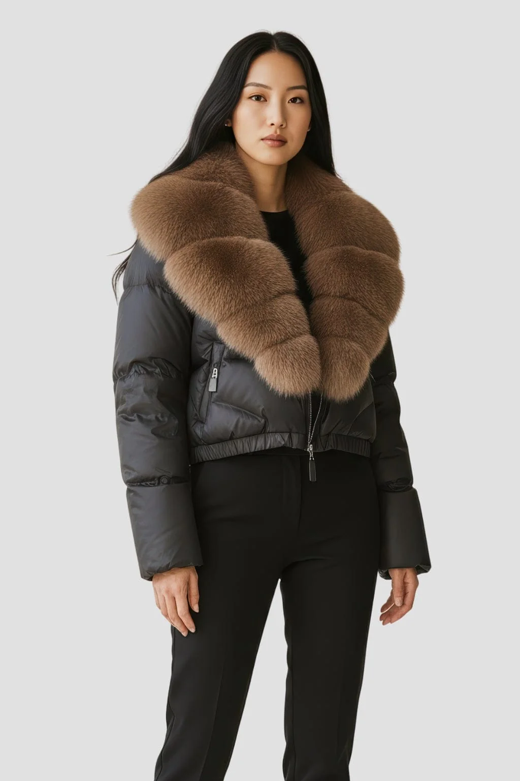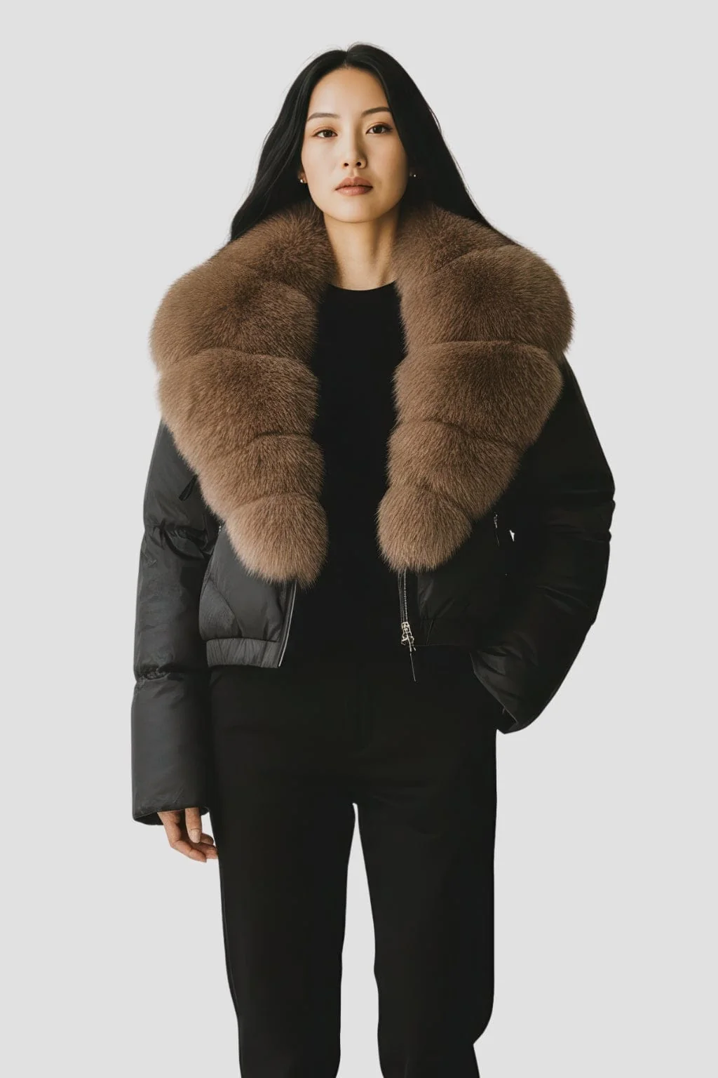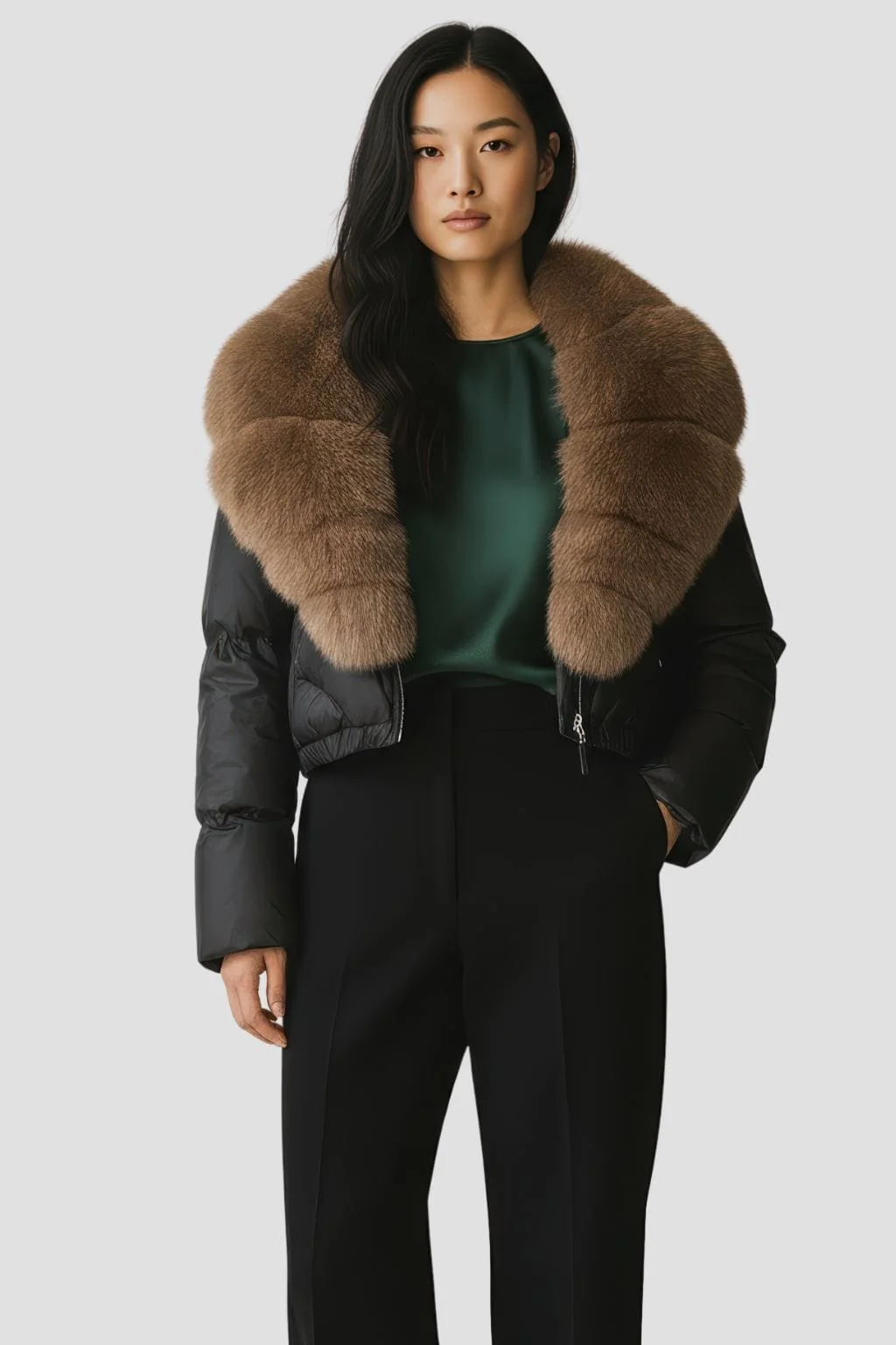 Pensée comme un blouson en fourrure mi-long pour femme, la pièce allonge visuellement la ligne sans la figer. Chaque pas révèle une intensité contenue et une allure posée. La présence s’inscrit dans le temps avec une sobriété qui compte.
