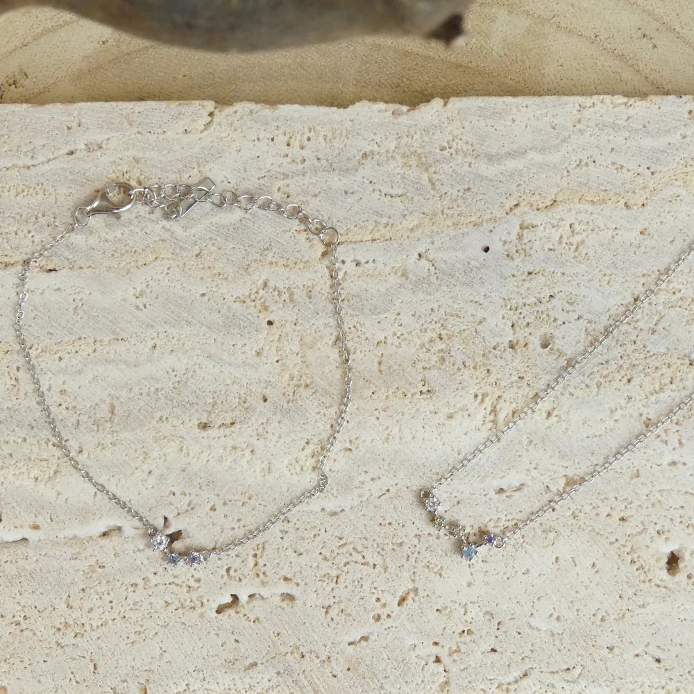 Le bracelet Orion est composé de 3 petites pierres colorées représentant la Lune, la Terre et Neptune. Nébuleuse adore porter les bijoux de façon asymétrique!