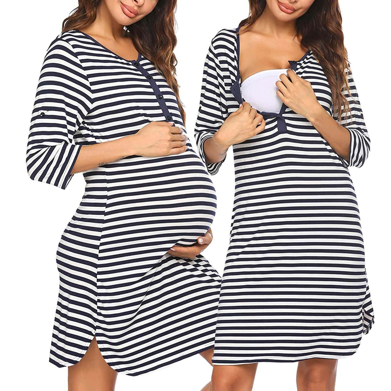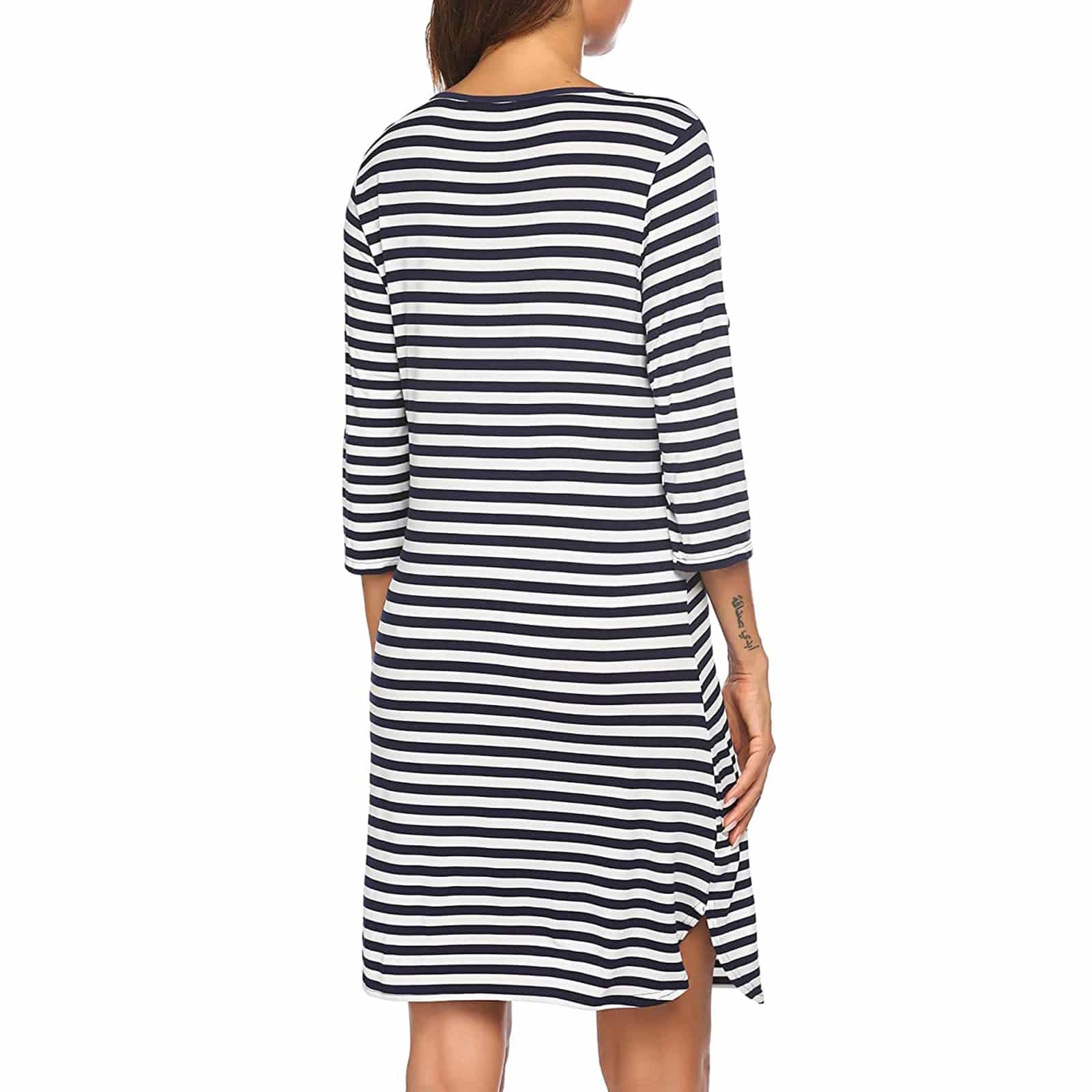Envie d’une robe de maternité à la fois élégante et confortable ? Notre chemise de nuit rayée bleu foncé est faite pour vous ! Avec ses manches trois quarts et sa matière extensible, elle est idéale pour votre grossesse. Vous pourrez ainsi ajouter une touche de style à votre look tout en profitant d’une robe pratique et douce !