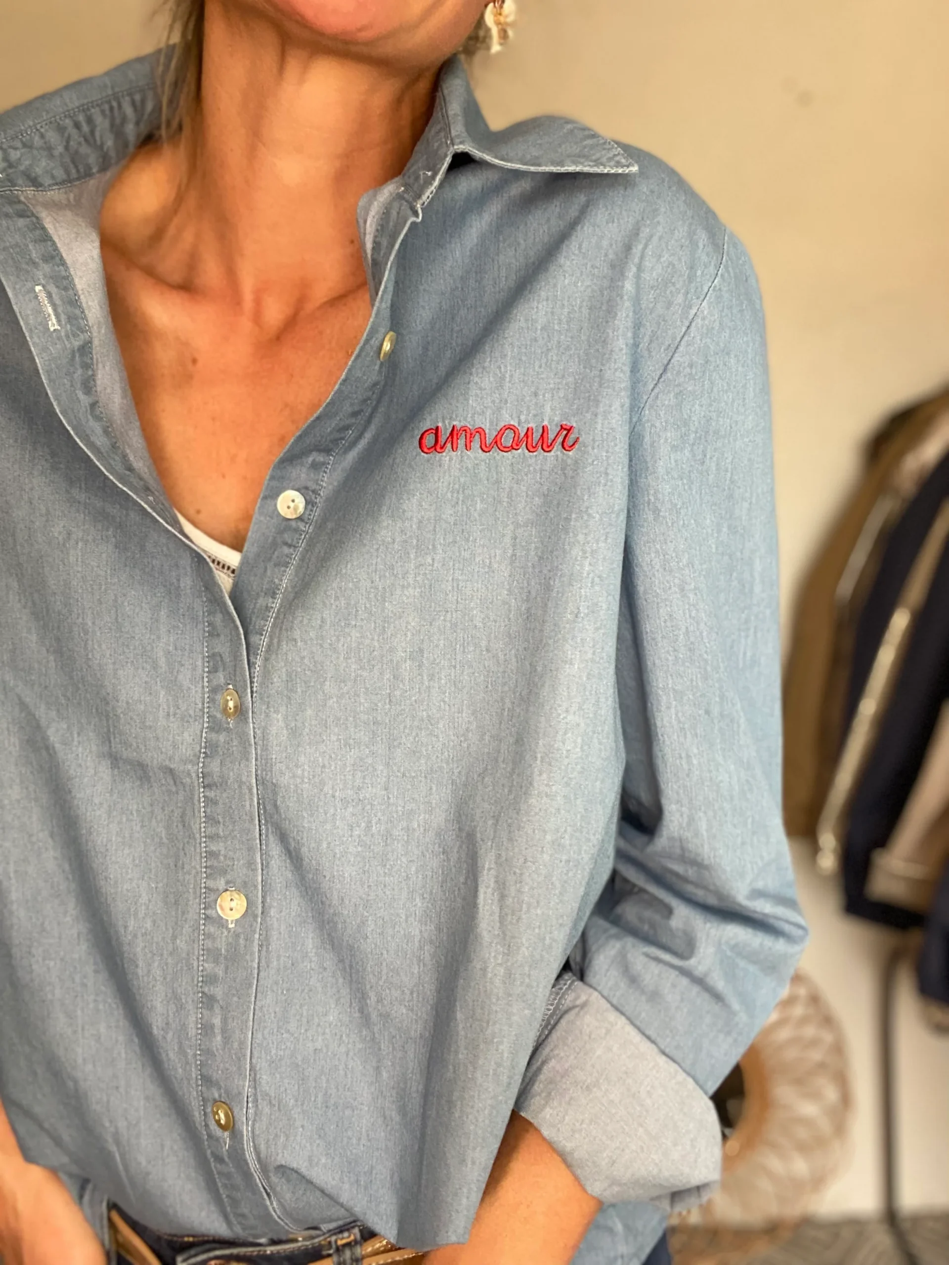 Chemise en coton brodé rouge amour IZÏA – Bleu jean