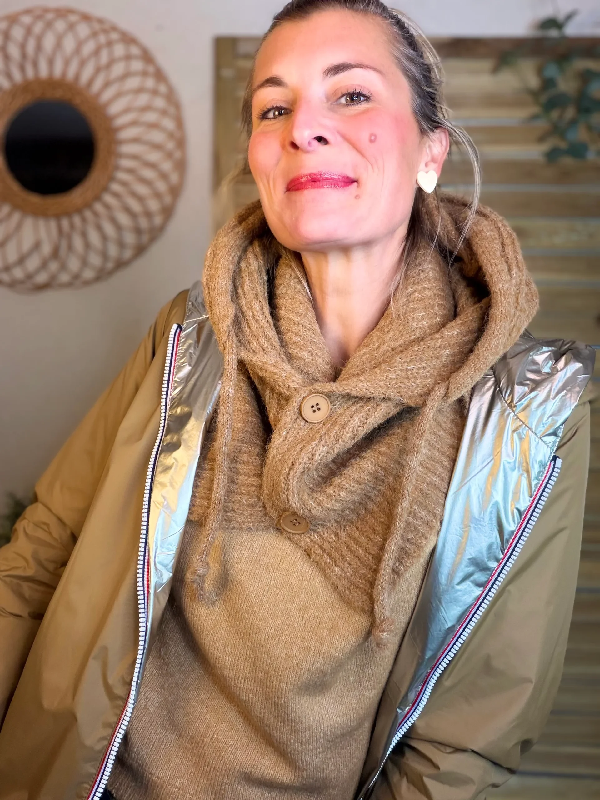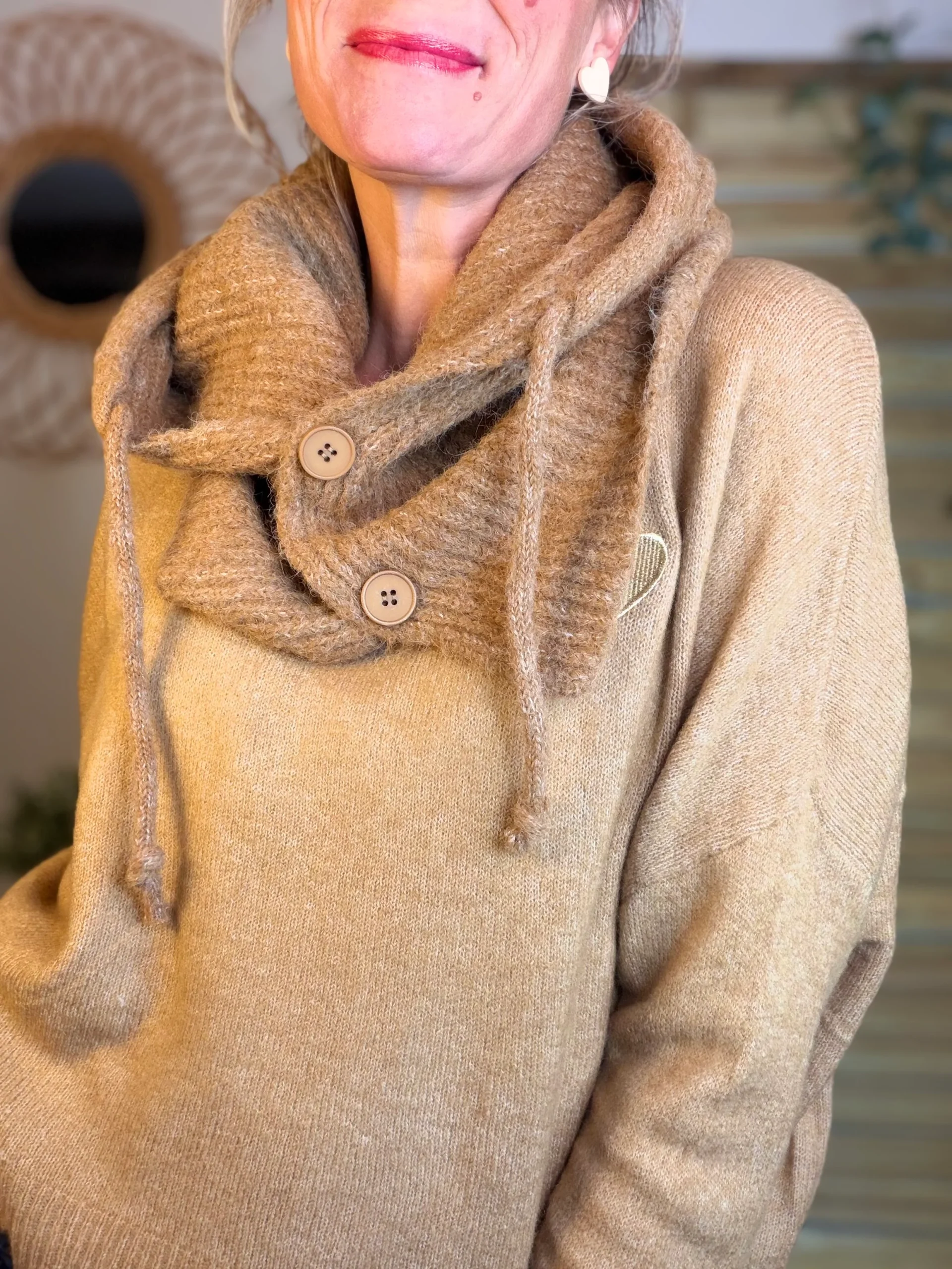 Col cagoule LORIE en maille avec bouton – Camel