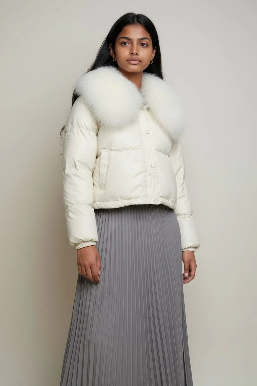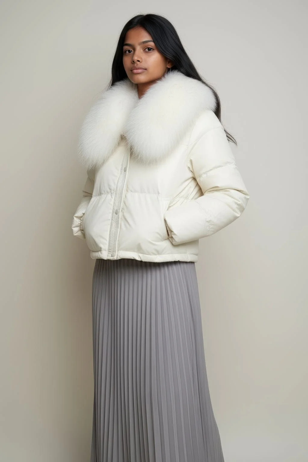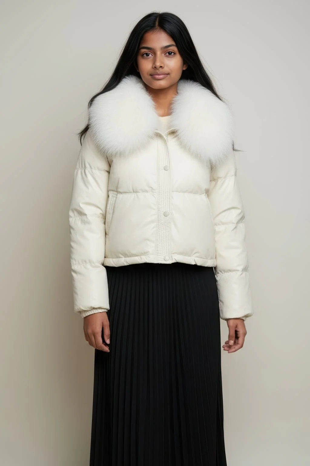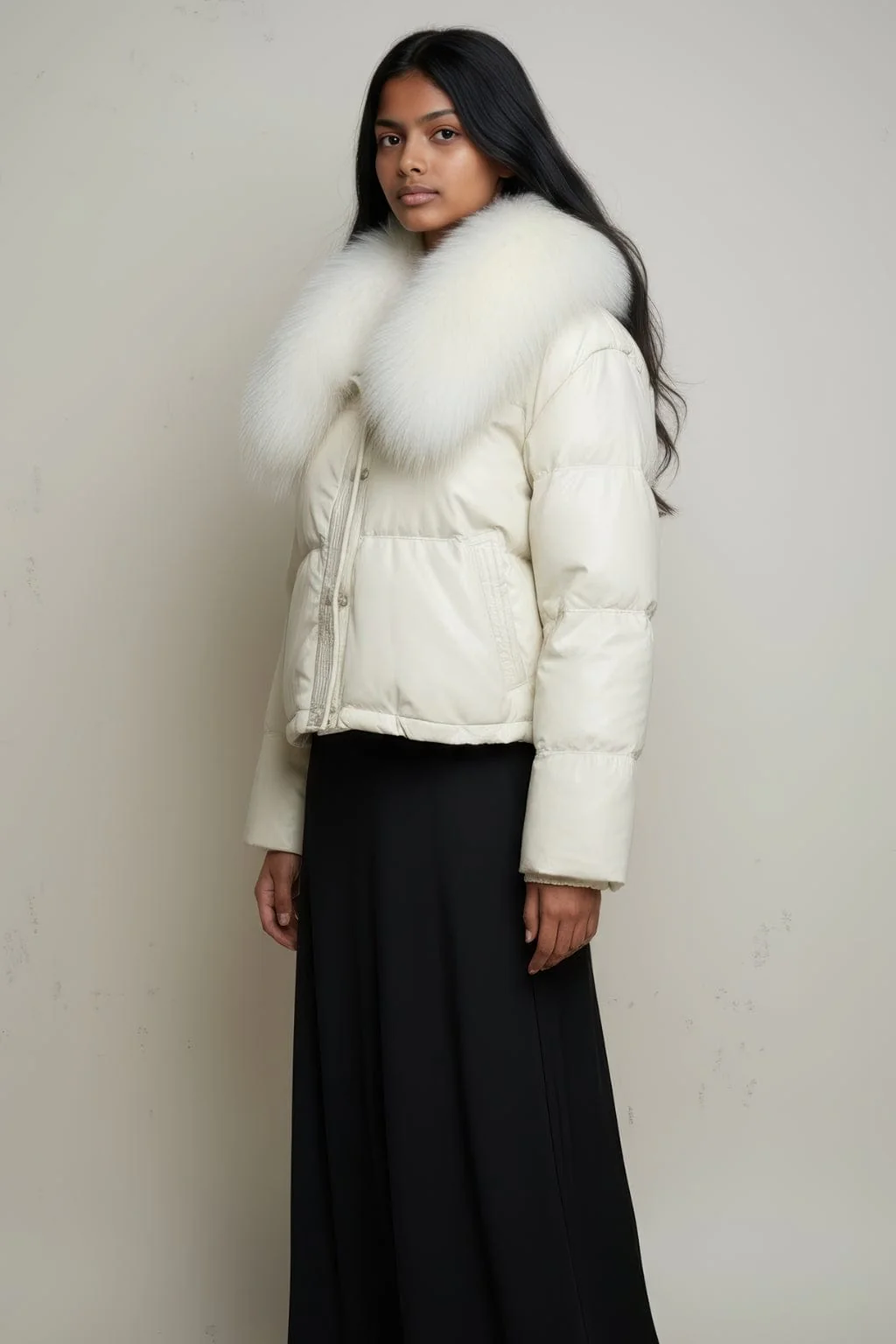 Profil court et éclat lumineux, la doudoune courte en fourrure femme blanc compose une silhouette nette et moderne. Le blanc du tissu souligne la pureté des lignes, tandis que la texture de la fourrure apporte un relief naturel.