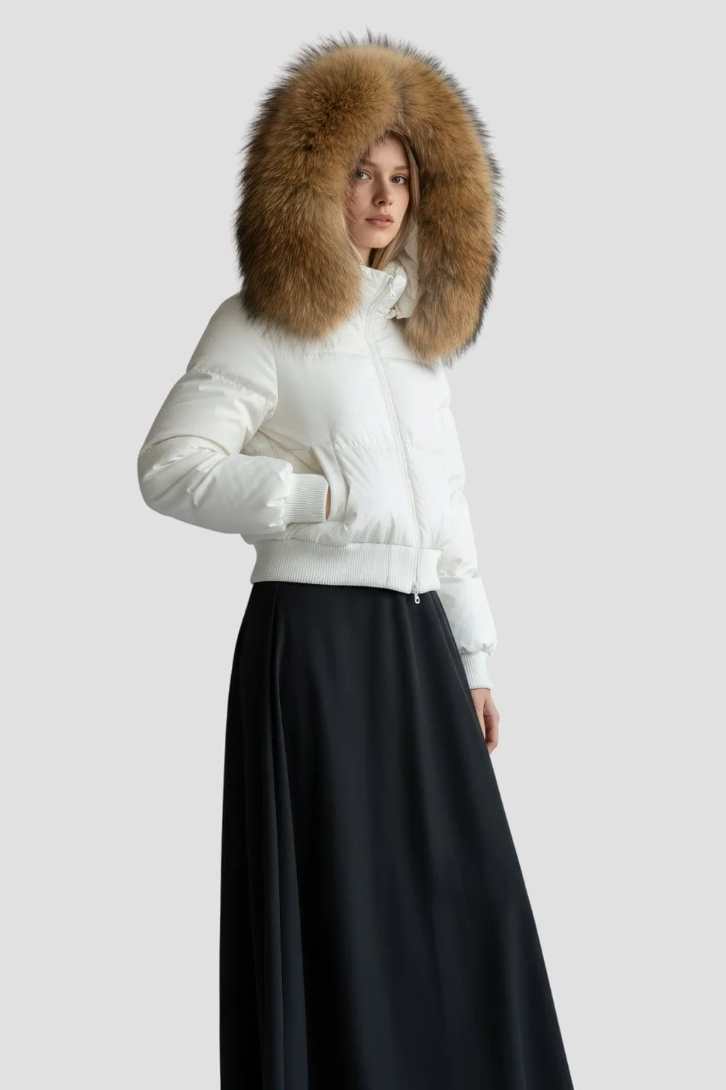 D’une clarté précieuse, la doudoune fourrure femme blanc impose une allure lumineuse et maîtrisée. Sa ligne de 50 cm allonge la silhouette et conjugue confort hivernal et élégance contemporaine.