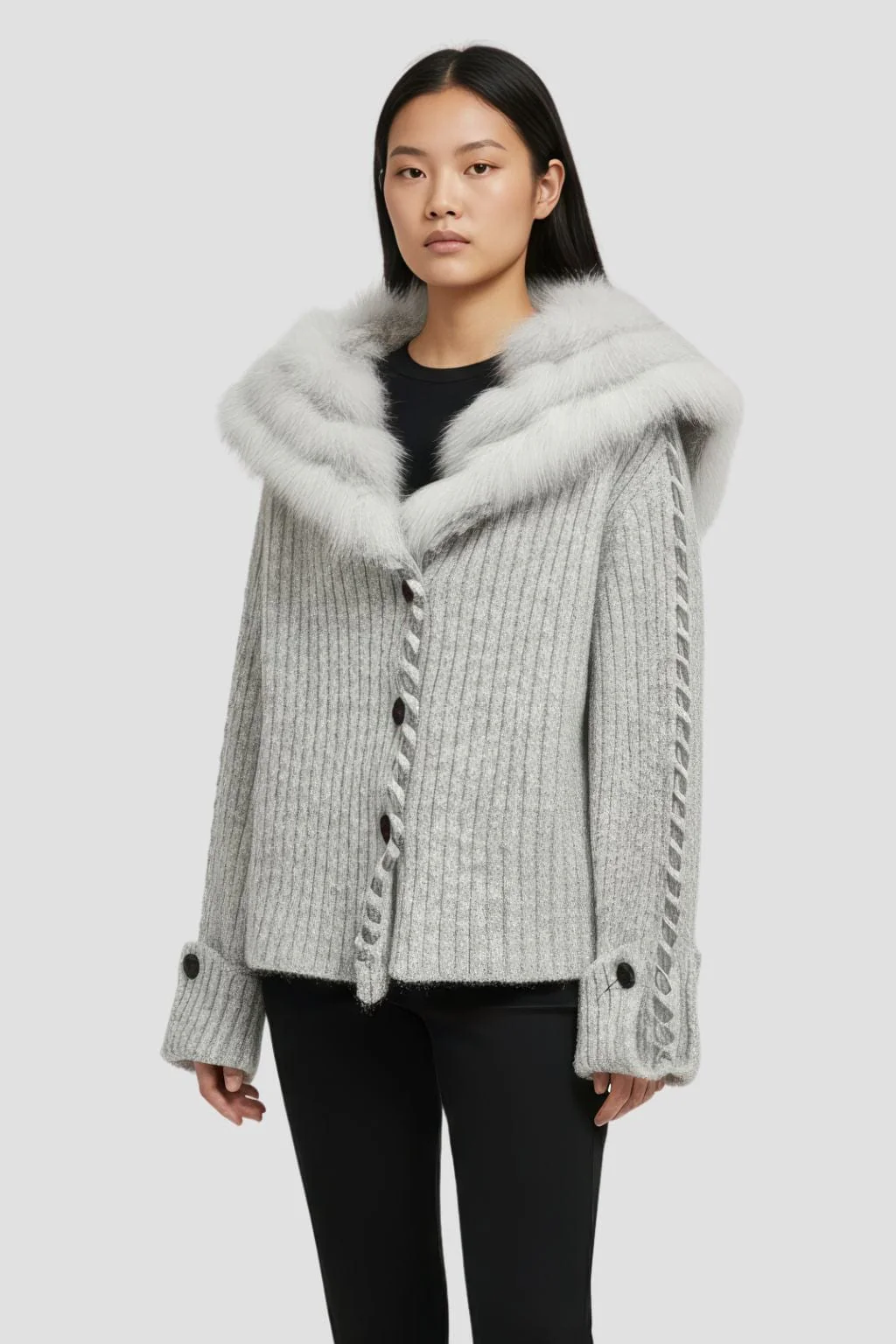 La laine argentée capte la lumière, tandis que la fourrure de renard blanche apporte un contraste harmonieux et une sensation de chaleur apaisante. Le gilet fourrure femme argenté se distingue par la clarté de ses tons et la délicatesse de ses matières.
