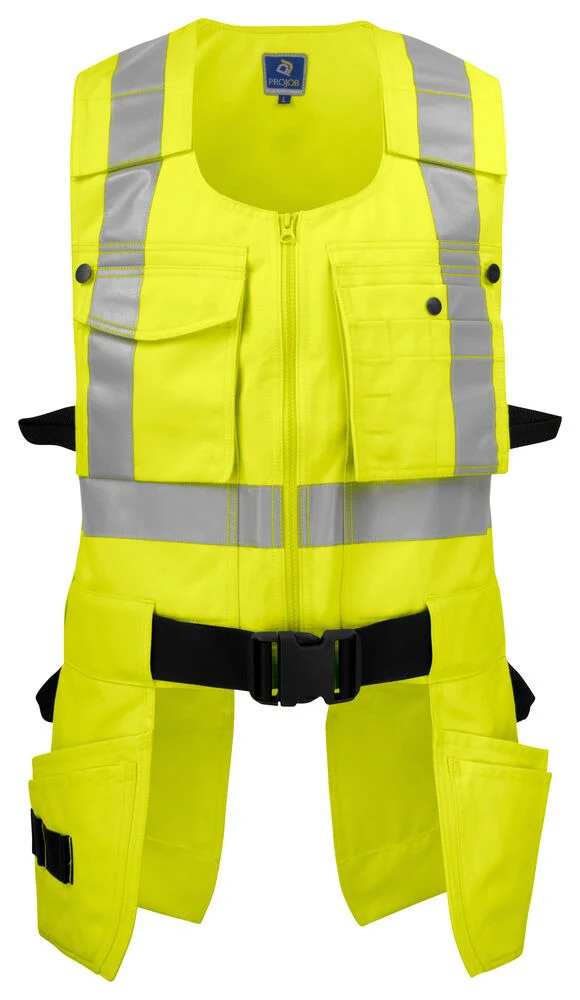 Gilet multipoches – Ceinture de support a/ boucle réglable maintenant la veste bien en place et partageant la charge s/ tout le buste – 275 g/m2 – Zip central YKK® double curseur – 2 anneaux en D – Larges pattes d’épaule ajustables par une fermeture velcro – 2 poches poitrine – Compartiment caché sous les poches de poitrine pour gants ou documents – Bouton et boucle pour étui à couteau – 4 poches à clous flottantes – Une des deux poches à clous à l’avant est dotée de poches supplémentaires – l’autre de boucles à outils – Les poches à clous sont renforcées en 100% Cordura® – Bretelles réglables – HV EN ISO 20471 Classe 2