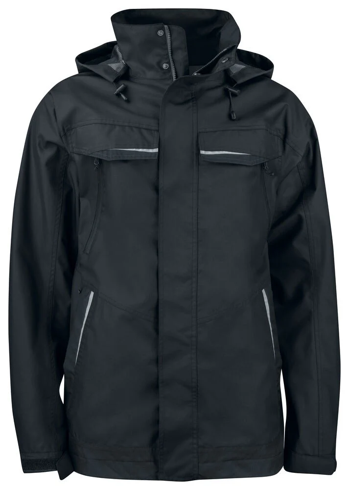Parka doublée technique coupe-vent et imperméable a/ coutures thermo-soudées – EN 343 – Zip central sous rabat a/ double ouverture haut + bas – 2 poches poitrine + 2 poches a/ rabat + 2 a/zips étanches – Boucle pour carte d’identité sur le côté gauche – Poches latérales a/ zips + doublure polaire – 3 poches intérieures spacieuses – Capuche amovible et ajustable – Poignets et taille réglables – Détails réfléchissants devant et dans le dos – La doublure matelassée peut être ouverte pour faciliter l’impression et la broderie- Couvre reins – Manches sans couture aux épaules – Finition double poignets