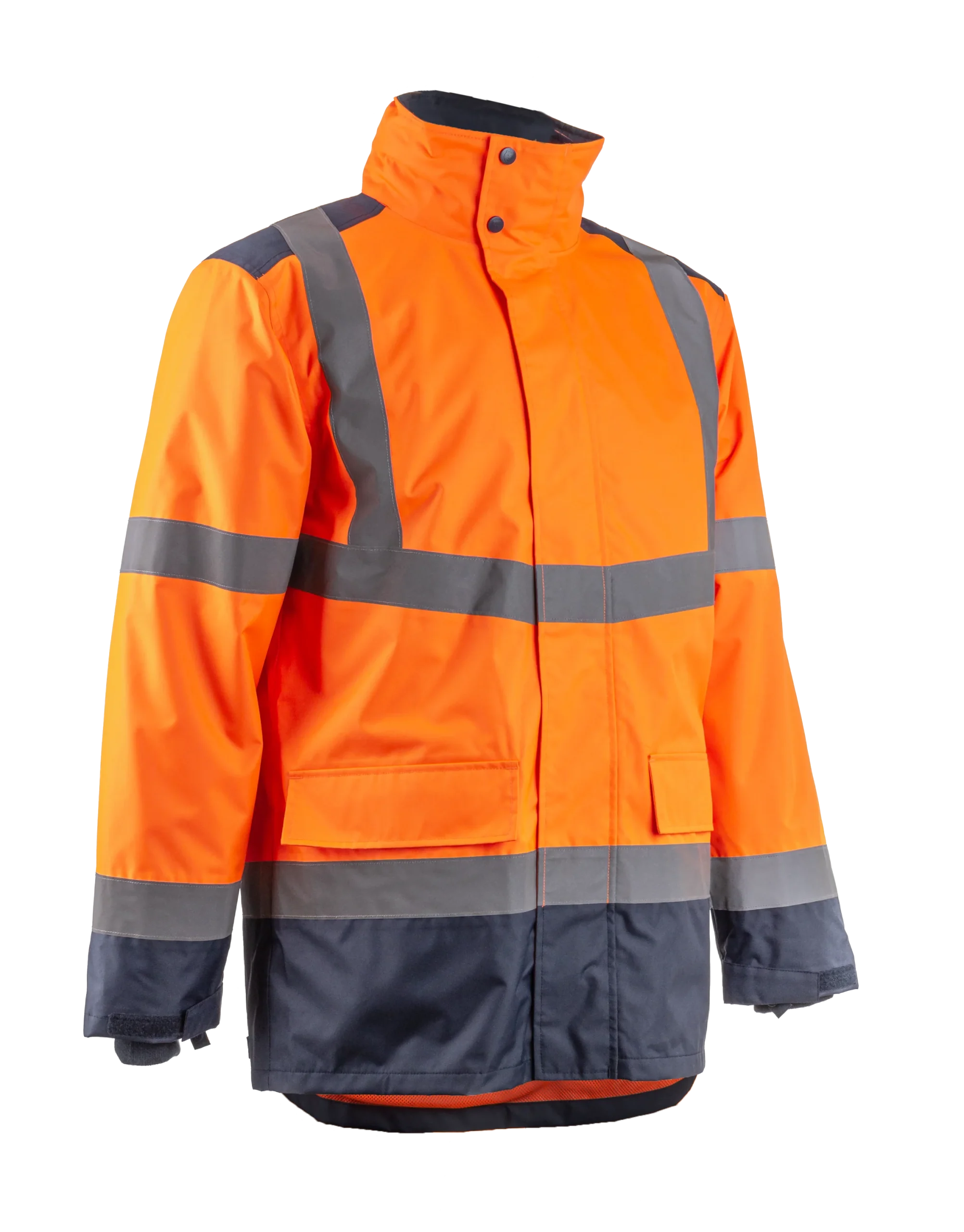 Parka Orange HV/Marine OXFORD : 100% Polyester enduit Polyuréthane – 300D DOUBLURE MESH: 100% Polyester – 75g/m2 (corps) Col montant Capuche fixe intégrée dans le col + Cordon de serrage Empiècements contrastés: Épaules + Bas + Poignets Zip central à double curseur sous rabat à scratchs + 2 pressions 2 poches basses sous rabat fermé par scratchs 1 poche Napoléon zippée sous rabat central 1 poche plaquée intérieure fermée par scratch Poignets réglables par scratch