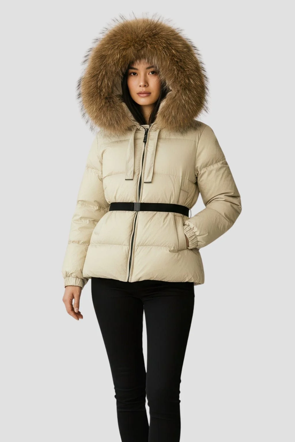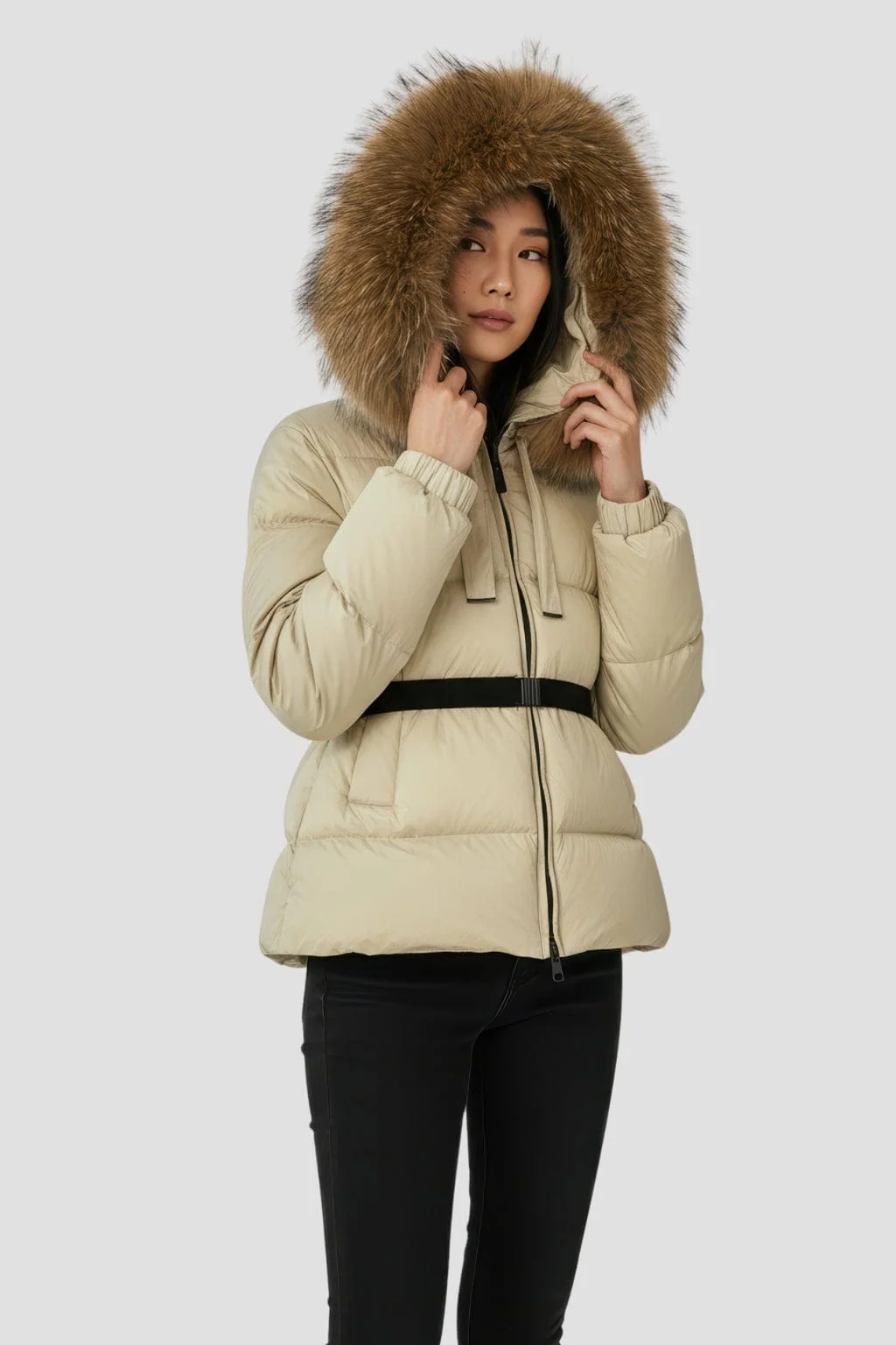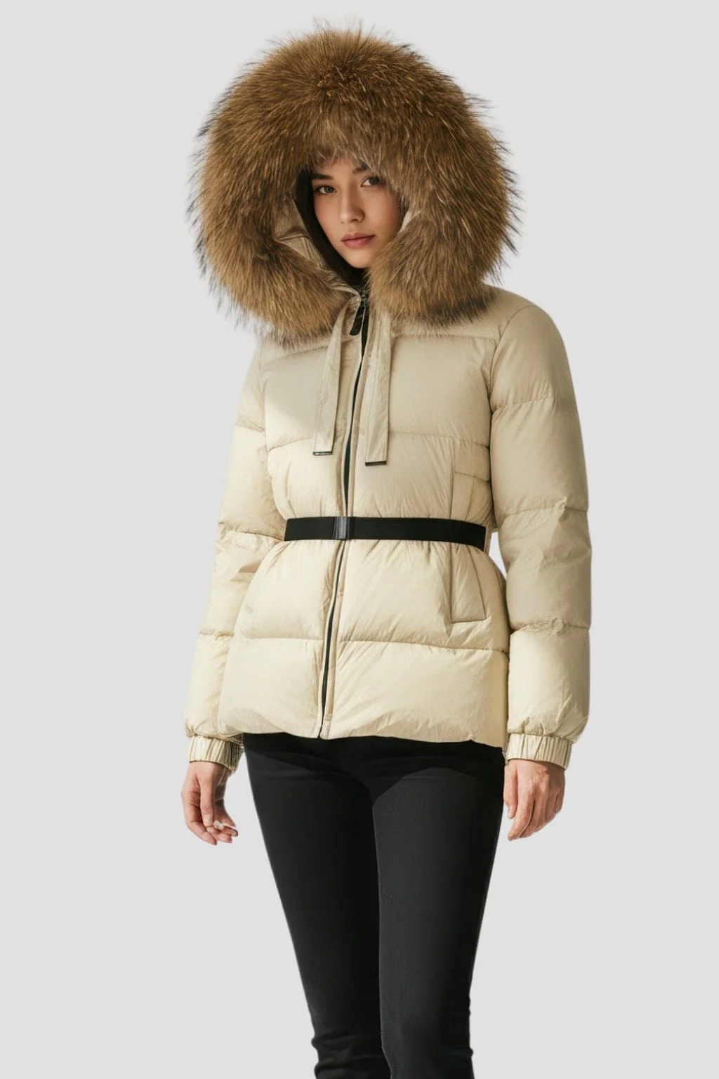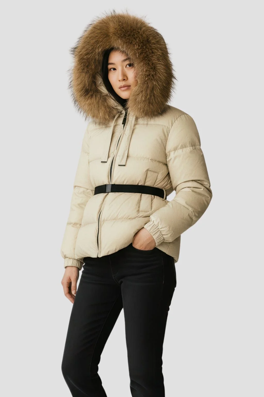 Au porté, la parka imperméable en fourrure beige associe isolation légère et tenue précise, maintenant une chaleur stable tout en préservant la liberté de mouvement.
