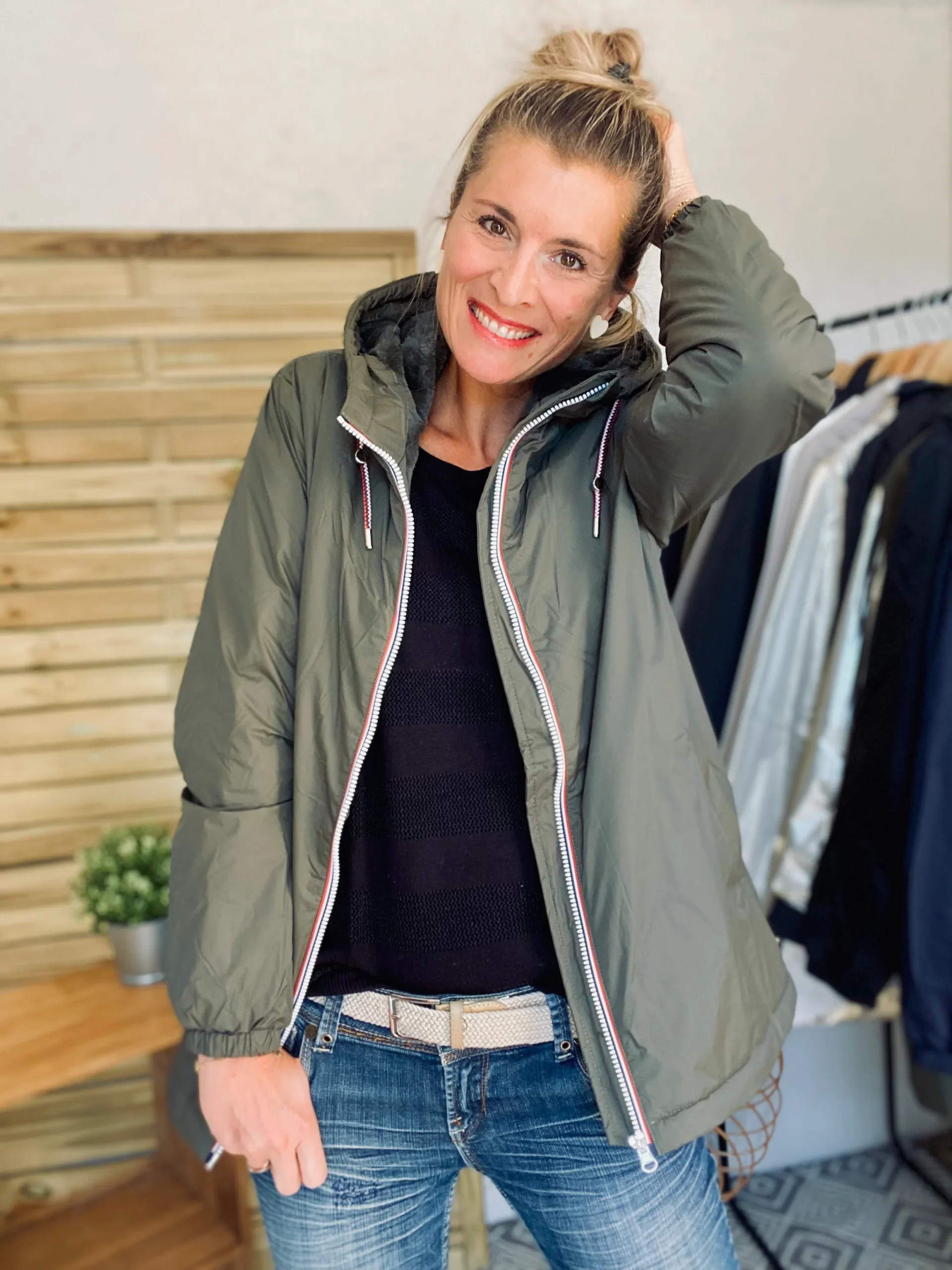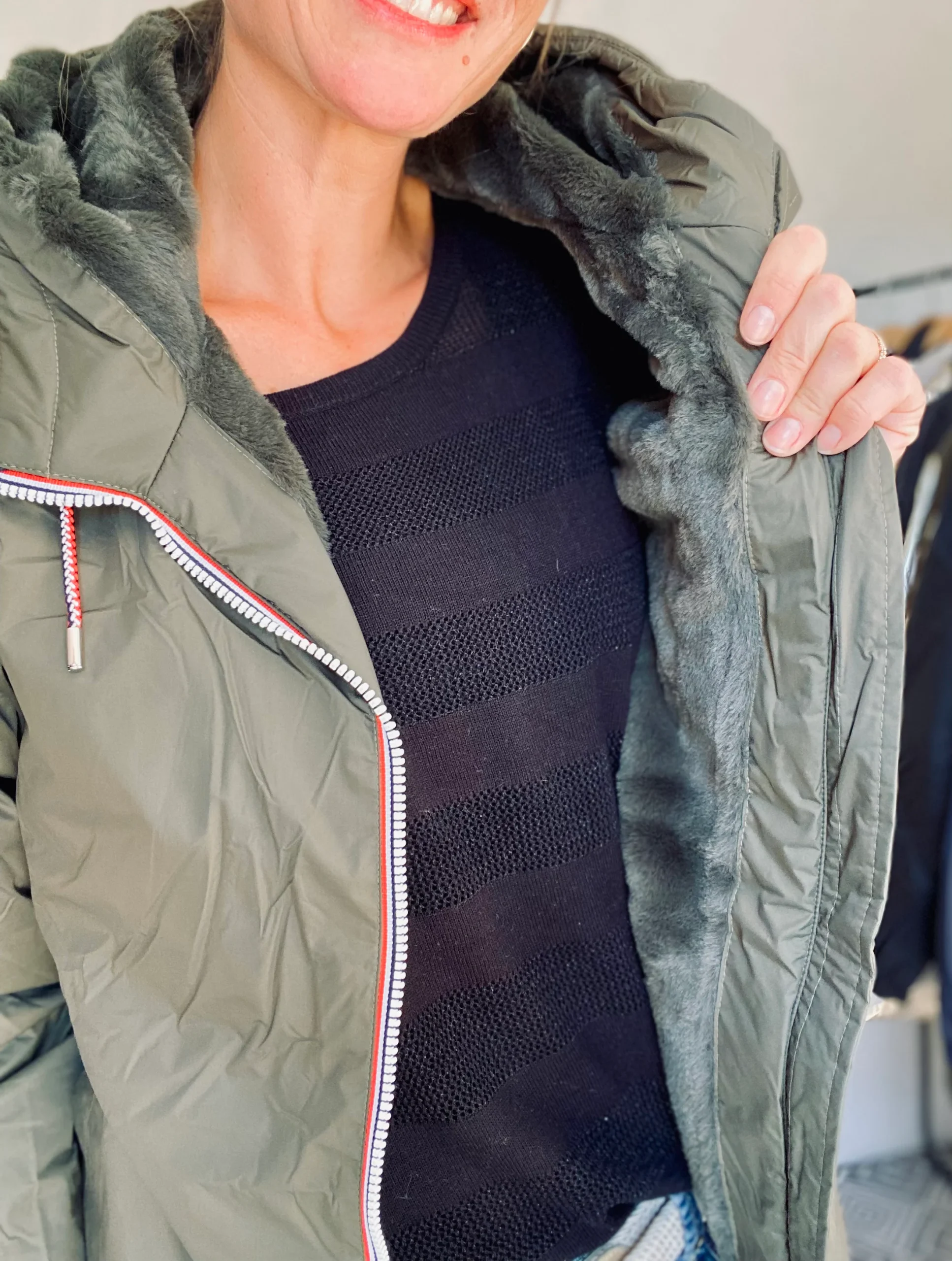 - Cordons tricolores de resserrage au niveau de la capuche