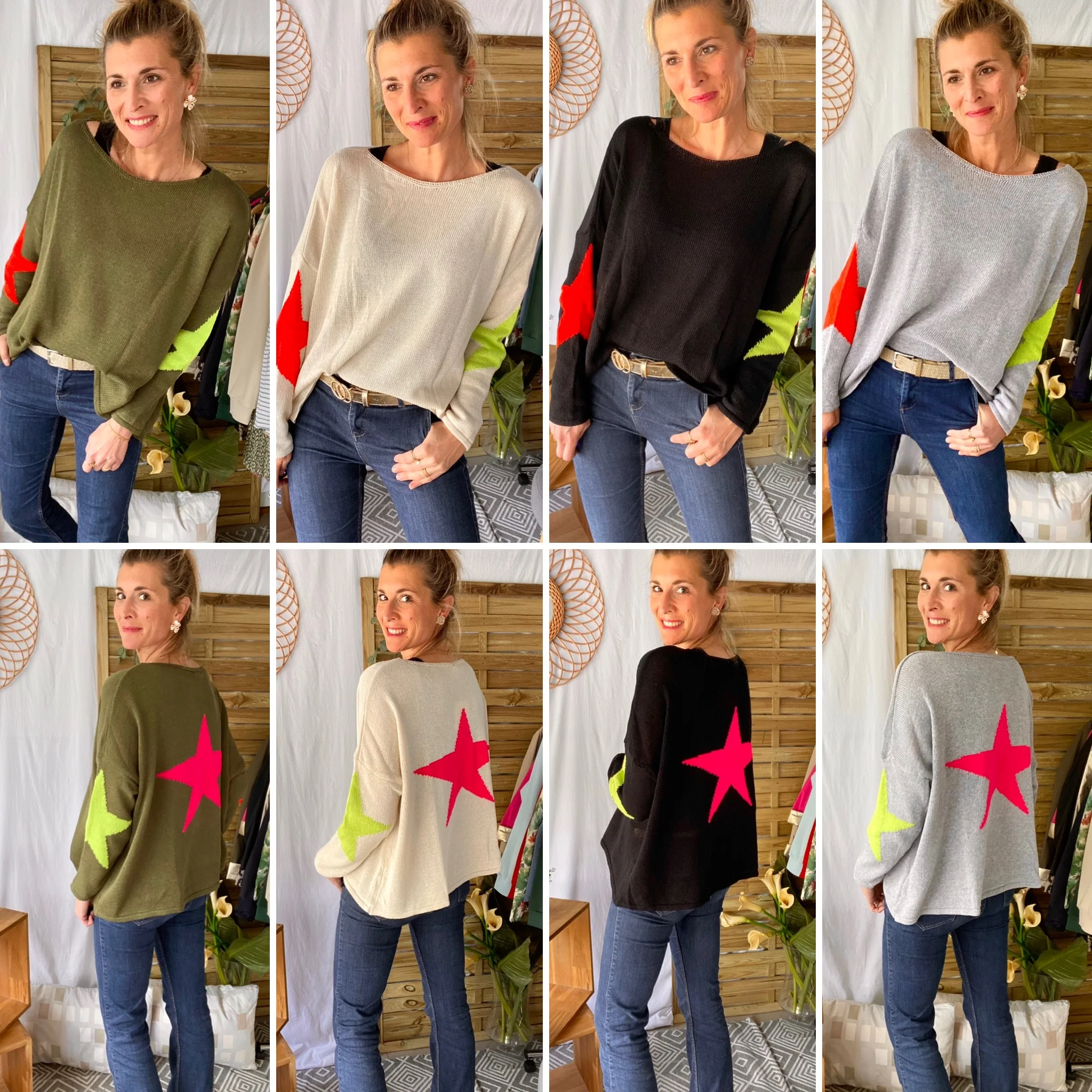 Taille unique Manches longues Coupe oversize Col large arrondi Imprimé etoiles coudes et dos (peut se porter derriere devant) 2 coloris: Kaki ou gris Compo : 75% coton/ 25% acrylique Fabriqué en Italie Taille unique, je porte habituellement du M/L en haut pour 1m75. Convient du 36 au 46
