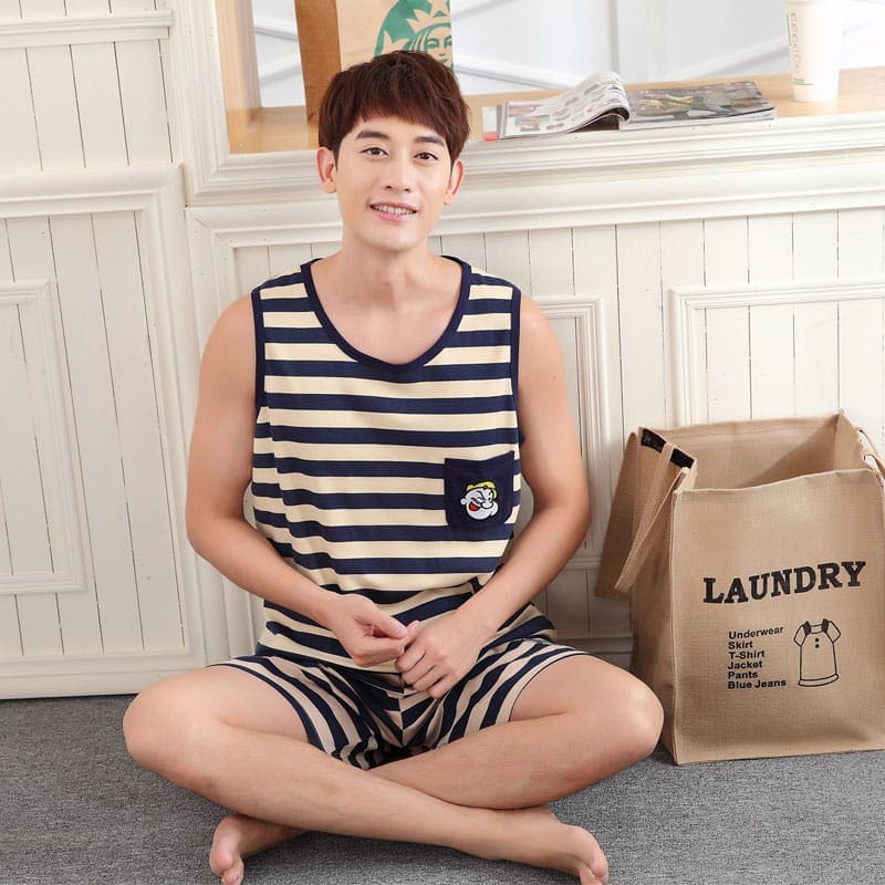 Pyjama d’été rayé noir et jaune en coton sans manche pour homme