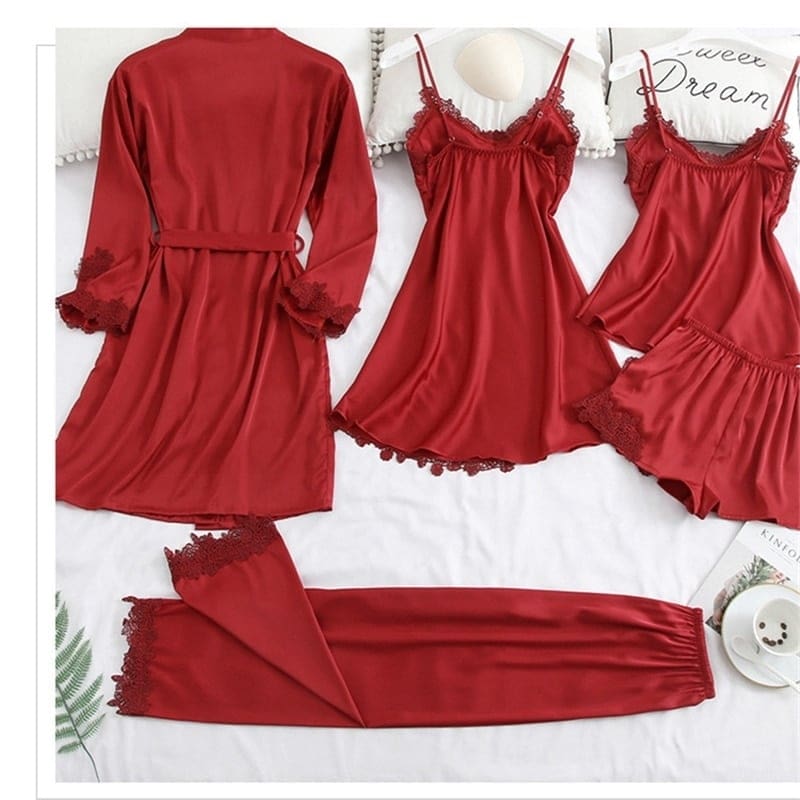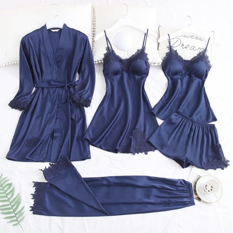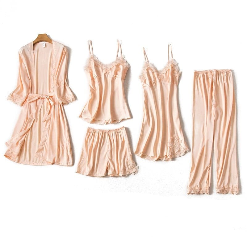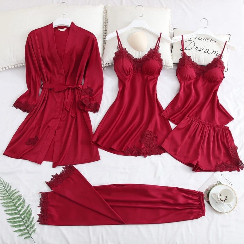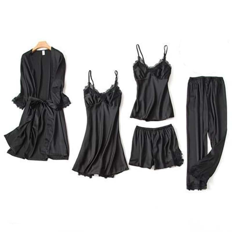 Ce ensemble de nuit en satin de soie procurera le plus grand confort pendant votre sommeil. Offrez-vous un look glamour et élégant, même lorsque vous êtes en pyjama grâce à son col en V qui féminisera votre silhouette et mettra en valeur vos atouts. Disponible en différents coloris, ce pyjama se compose de cinq pièces qui vous assureront des nuits douces et réparatrices.