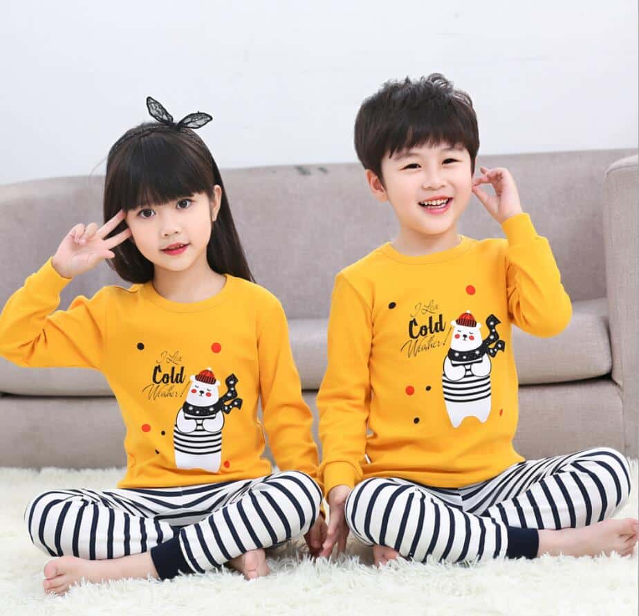 Cet ensemble de pyjama pour enfant est magnifique avec un pull à rayures jaune et blanc et un pantalon blanc avec une tête d’ours noir. Votre enfant adorera le style chic et marin de ce beau pyjama en coton.