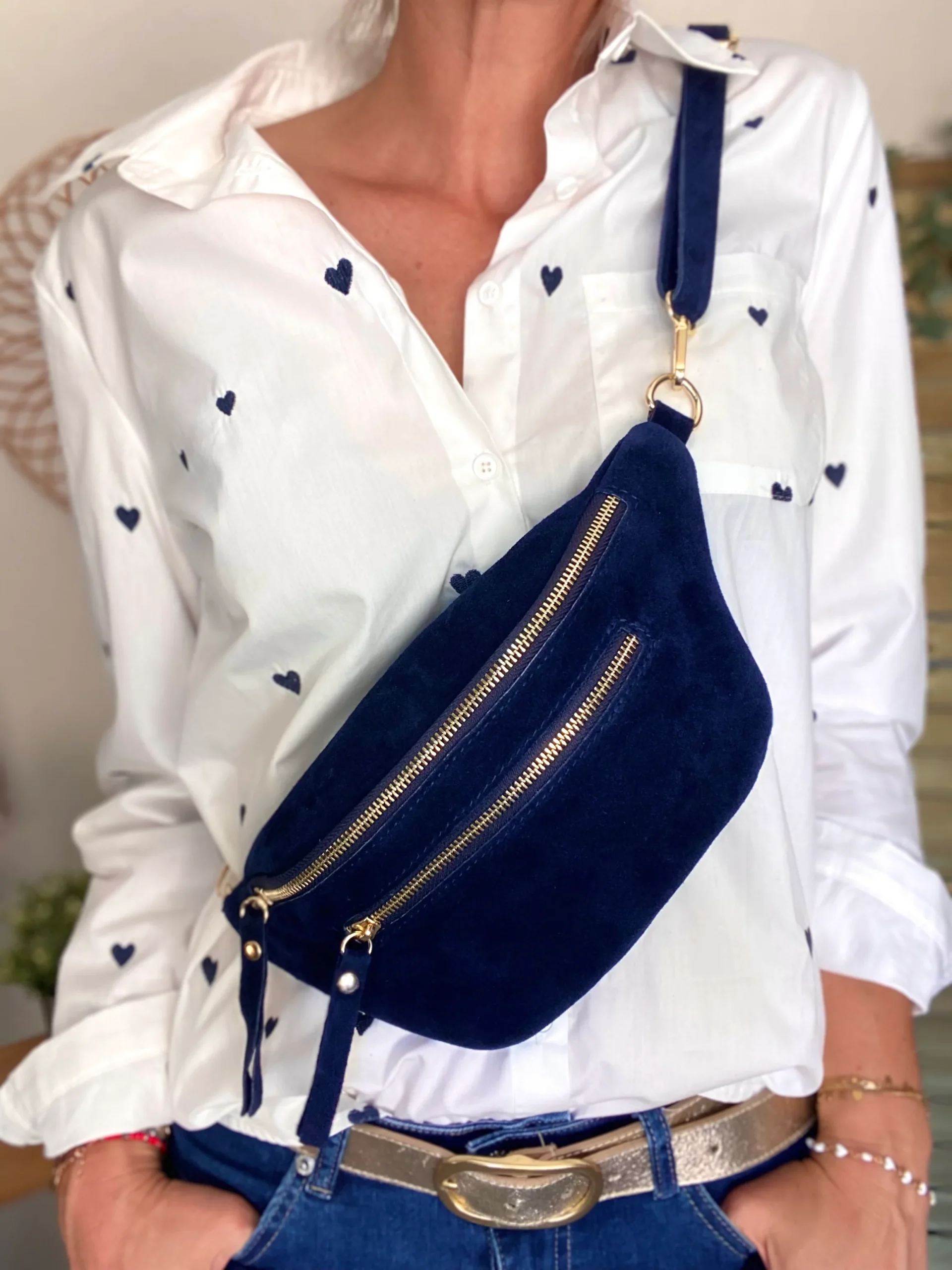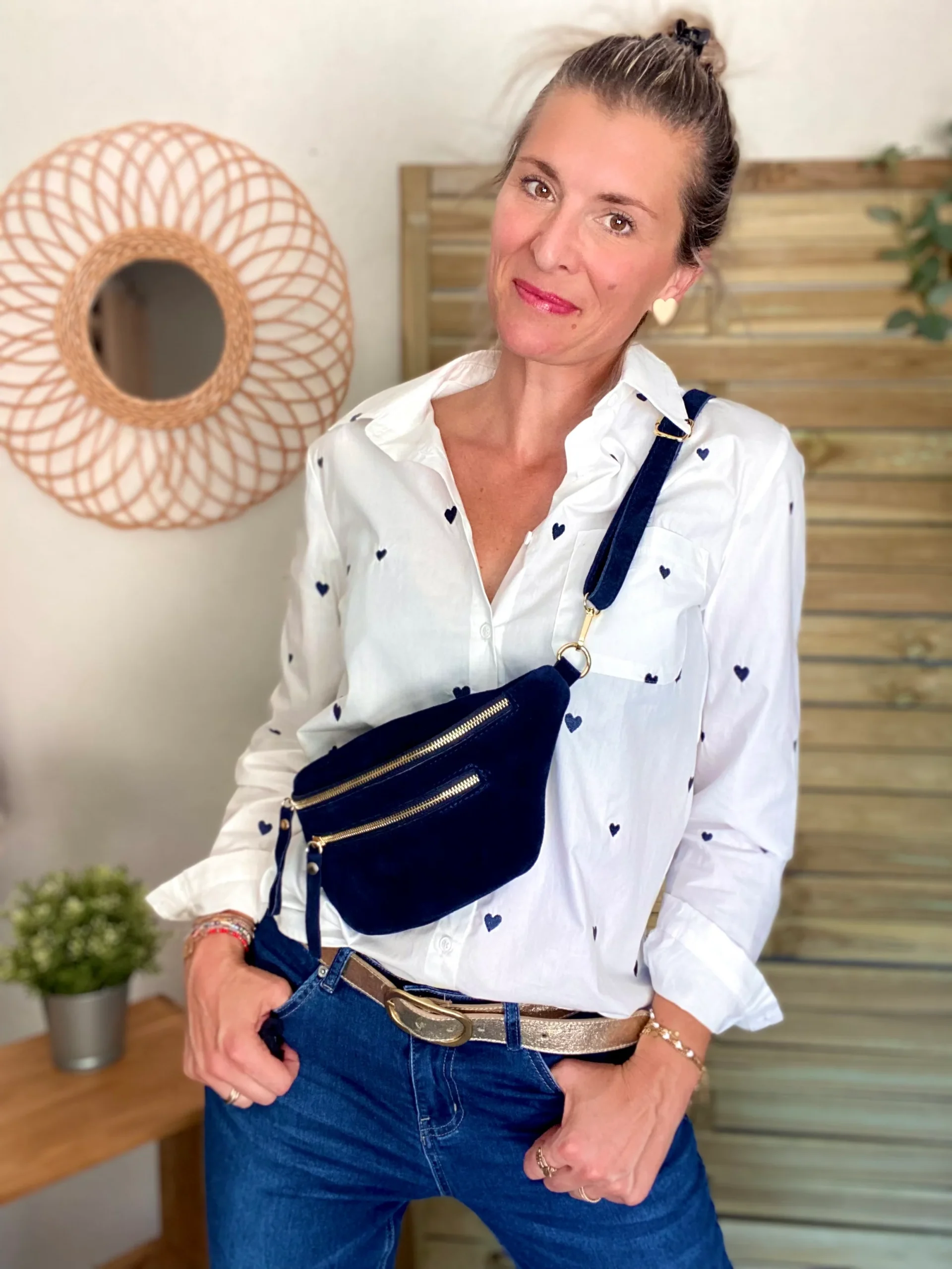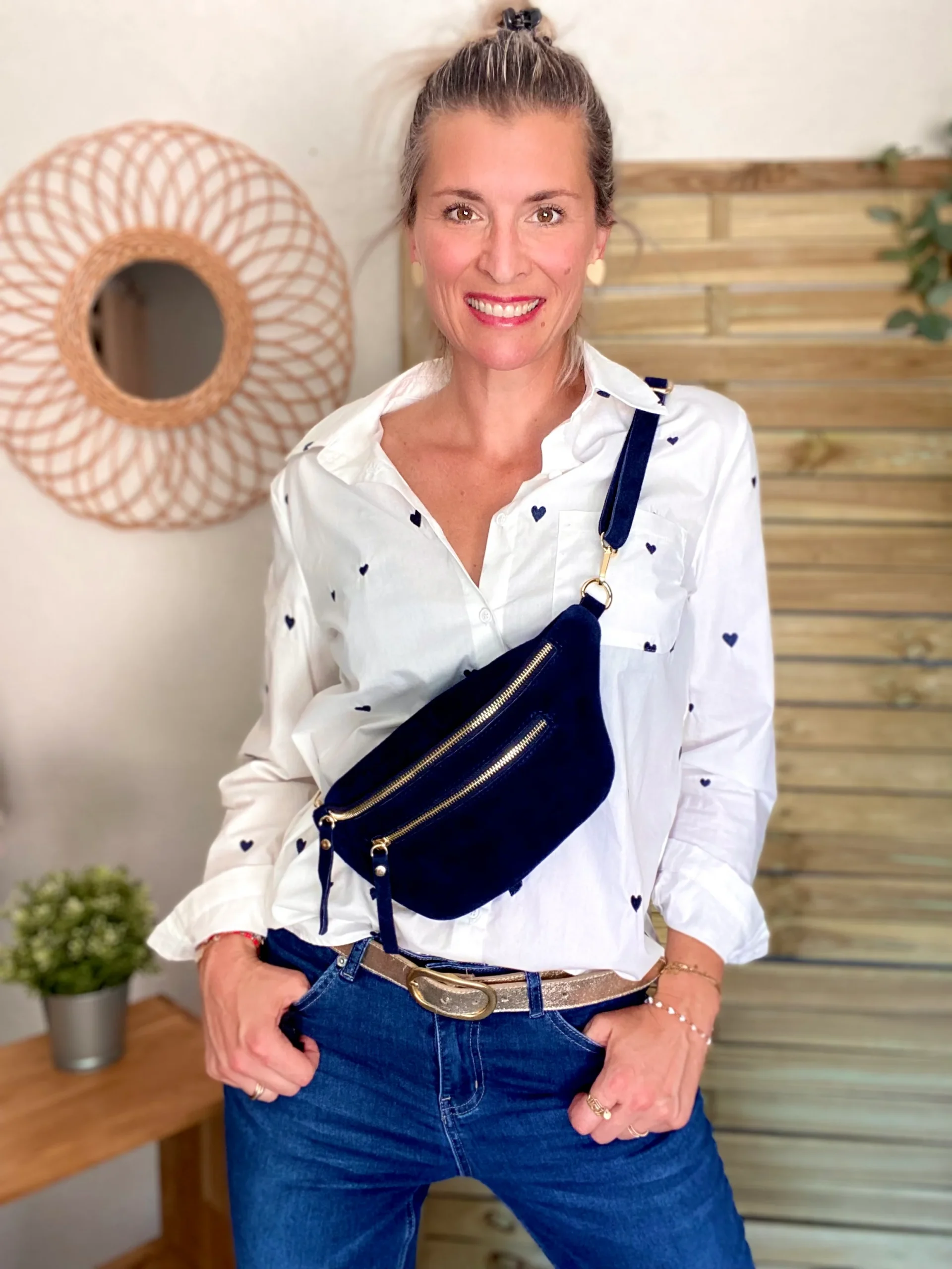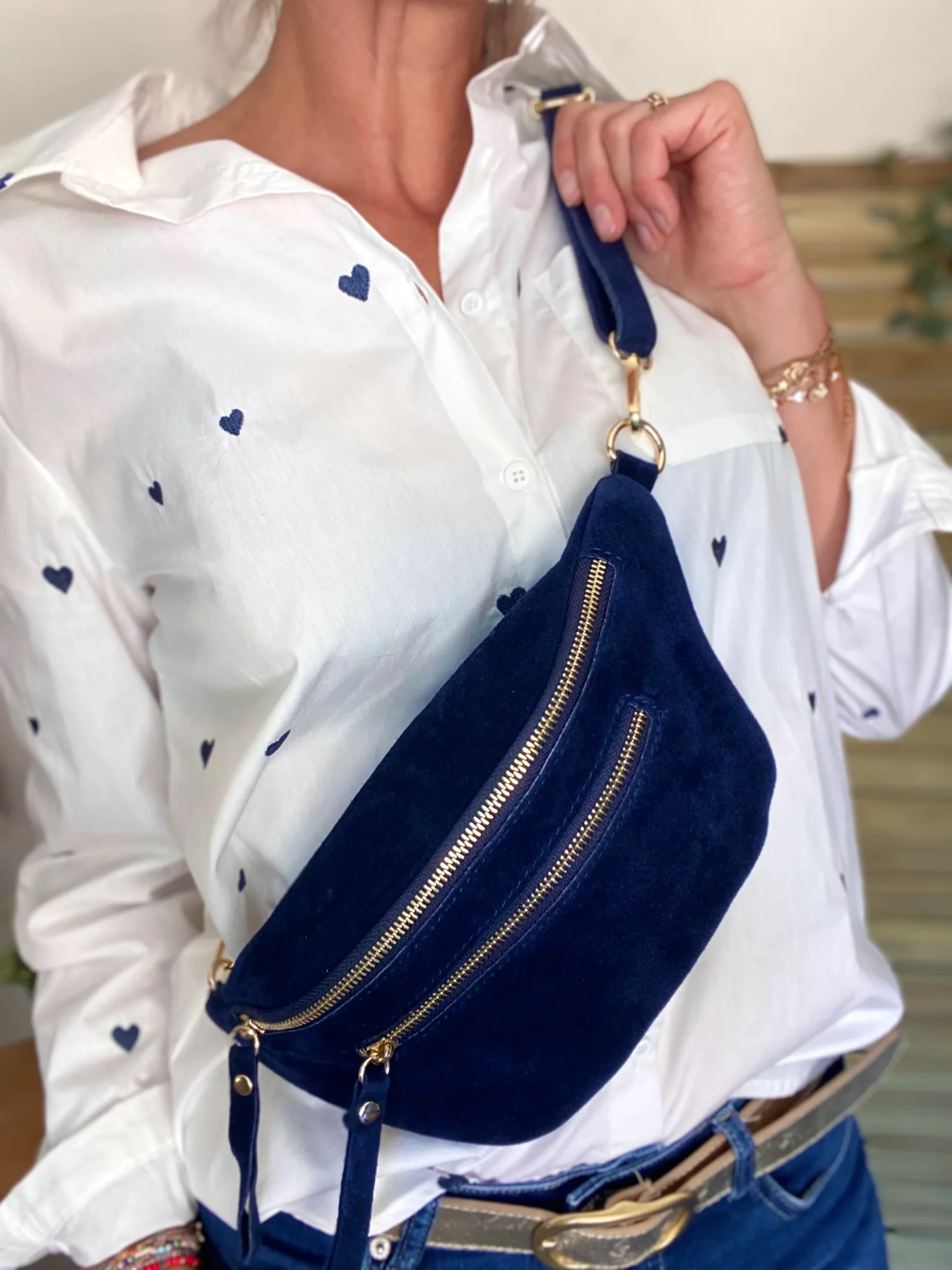 Sac banane avec poche avant, en cuir daim HOLLY – Bleu Marine