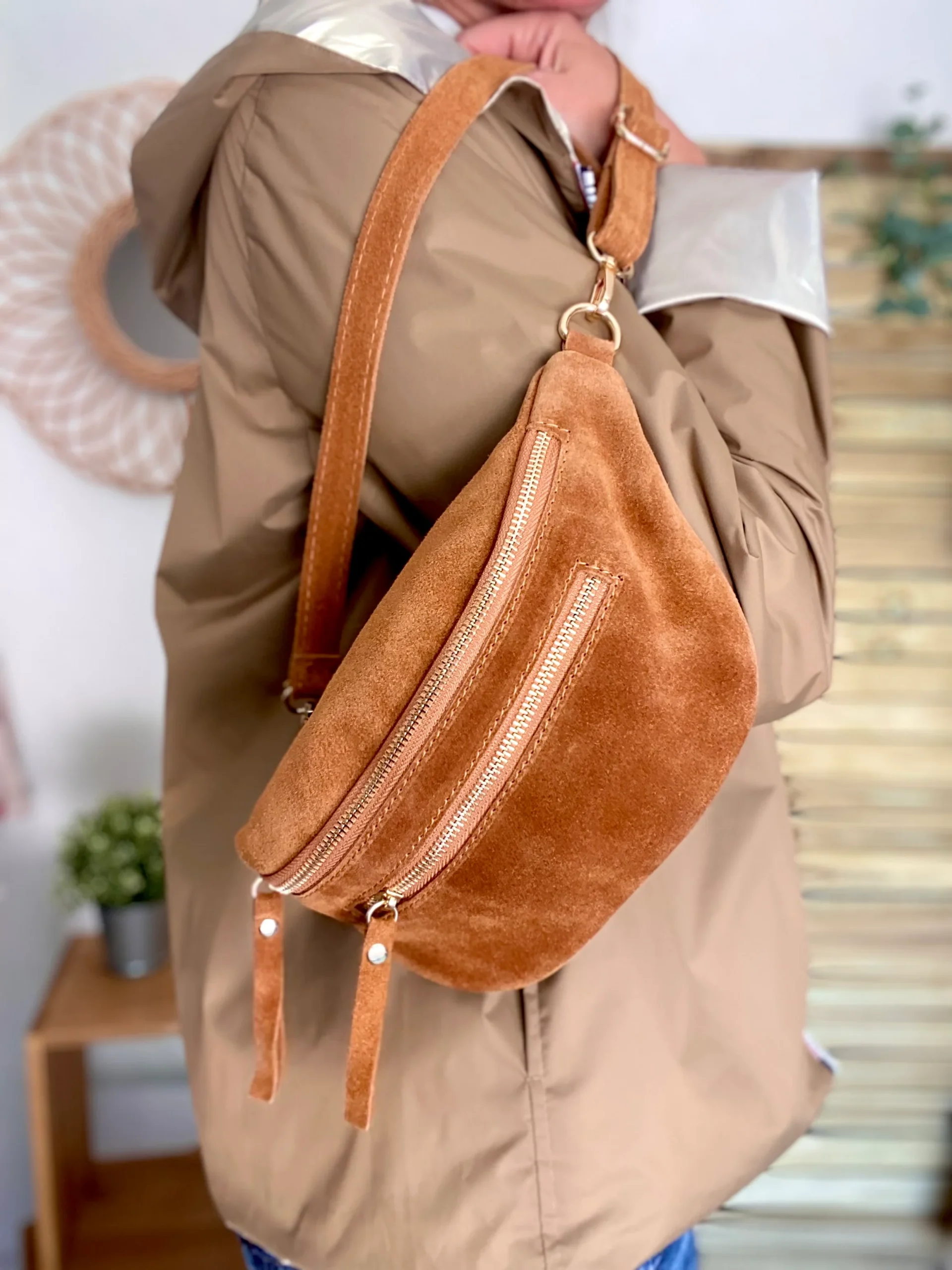Sac banane avec poche avant, en cuir daim HOLLY – Camel