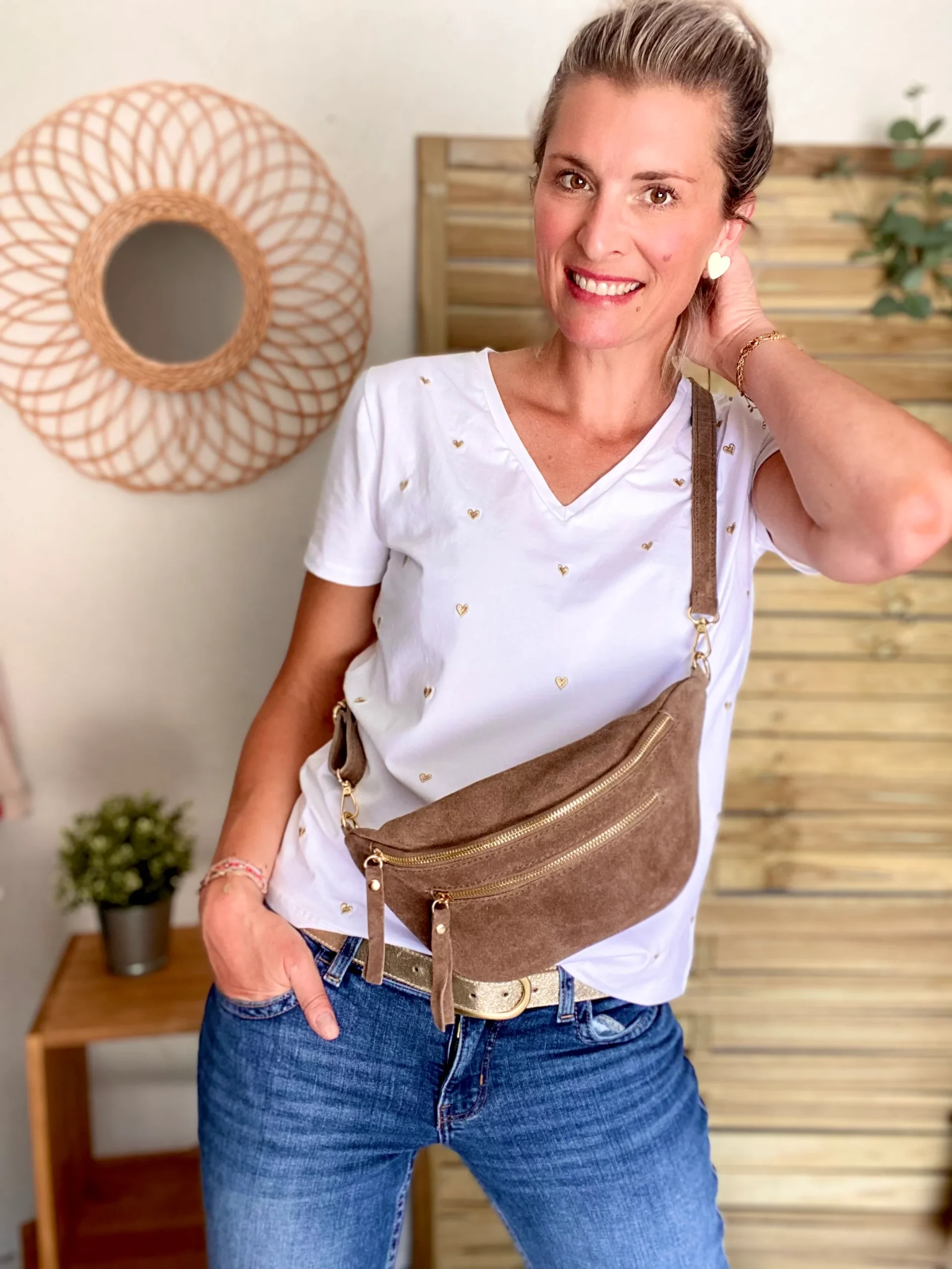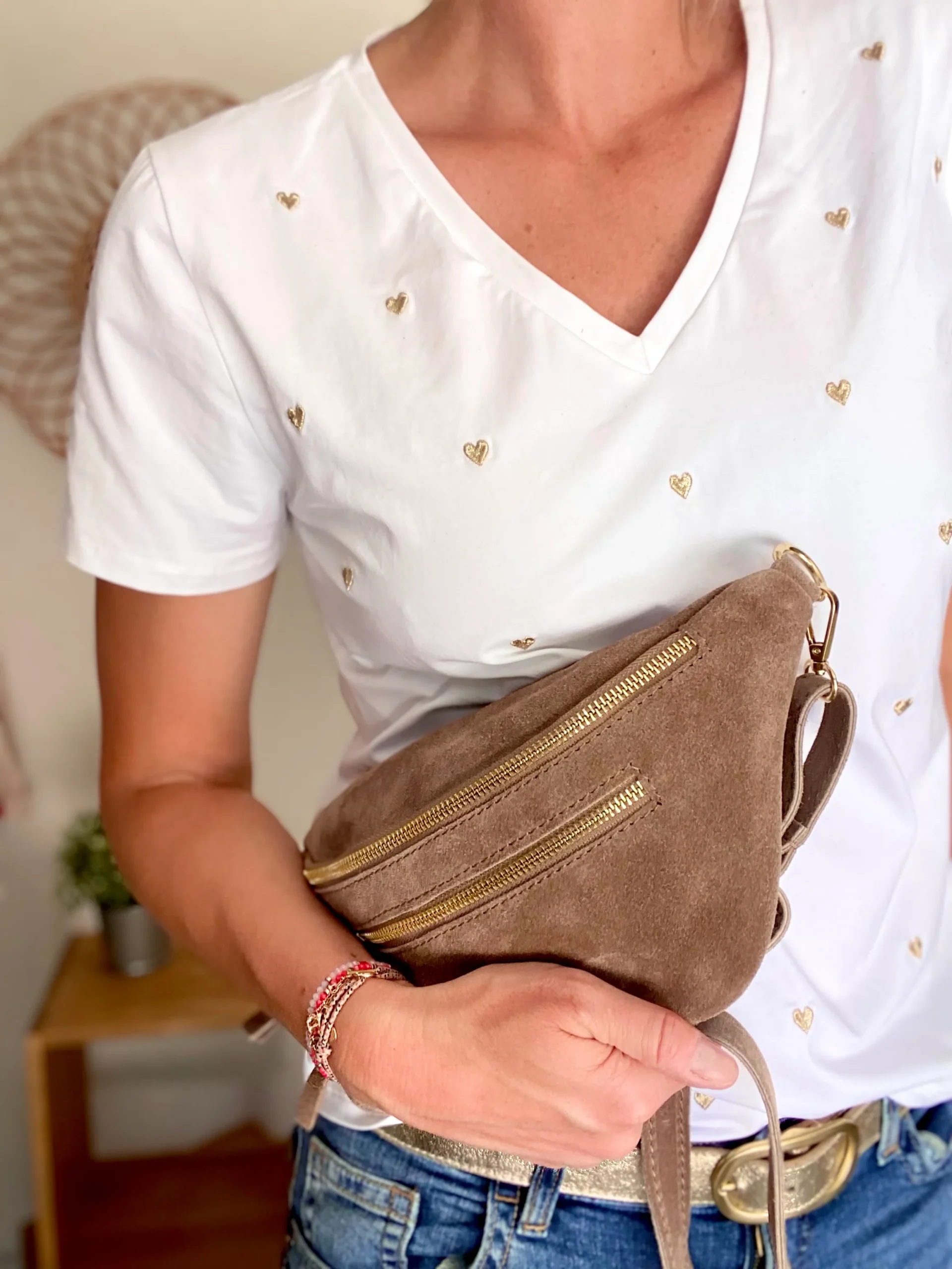 Sac banane avec poche avant, en cuir daim HOLLY – Taupe foncé (Café)