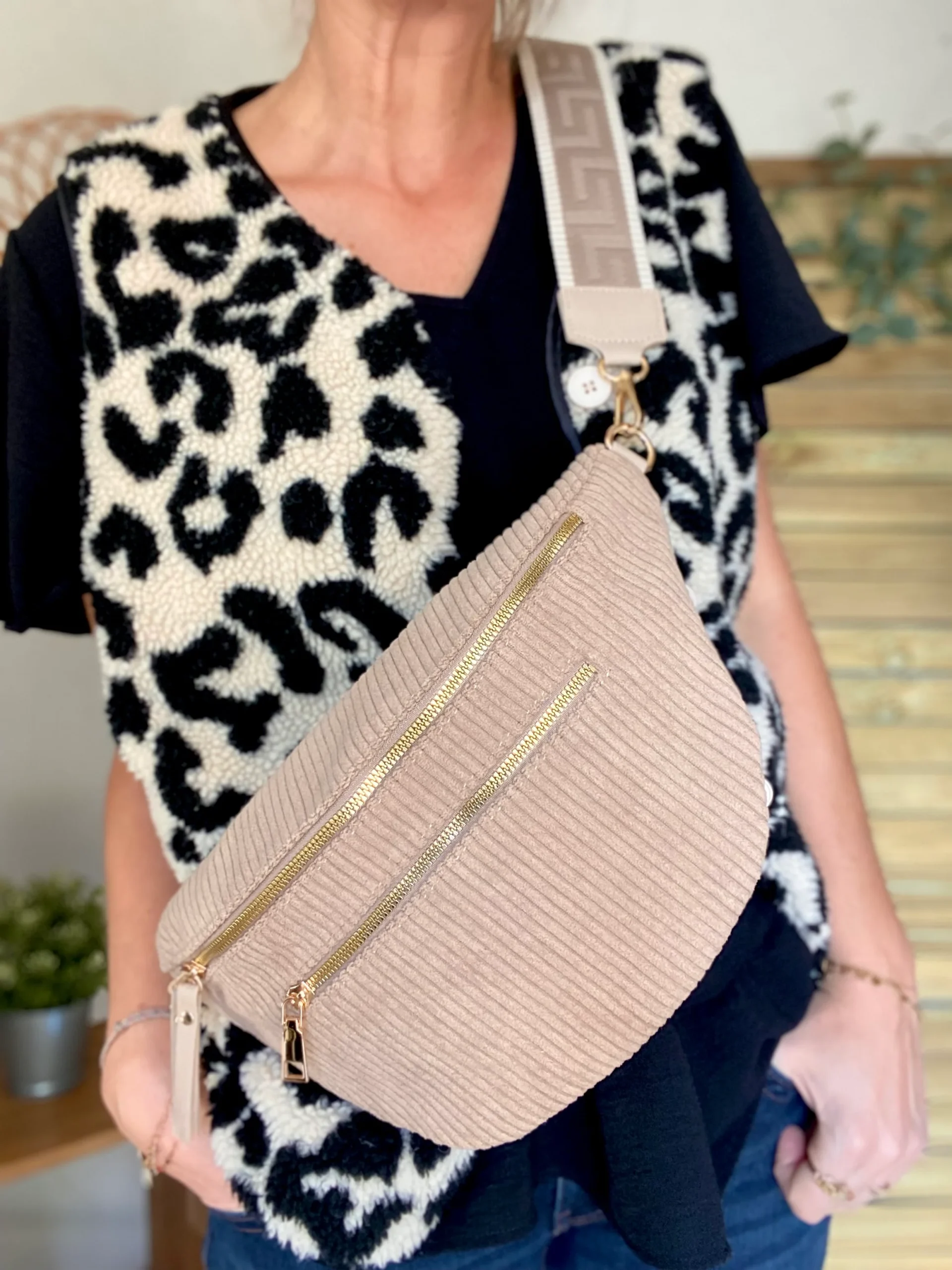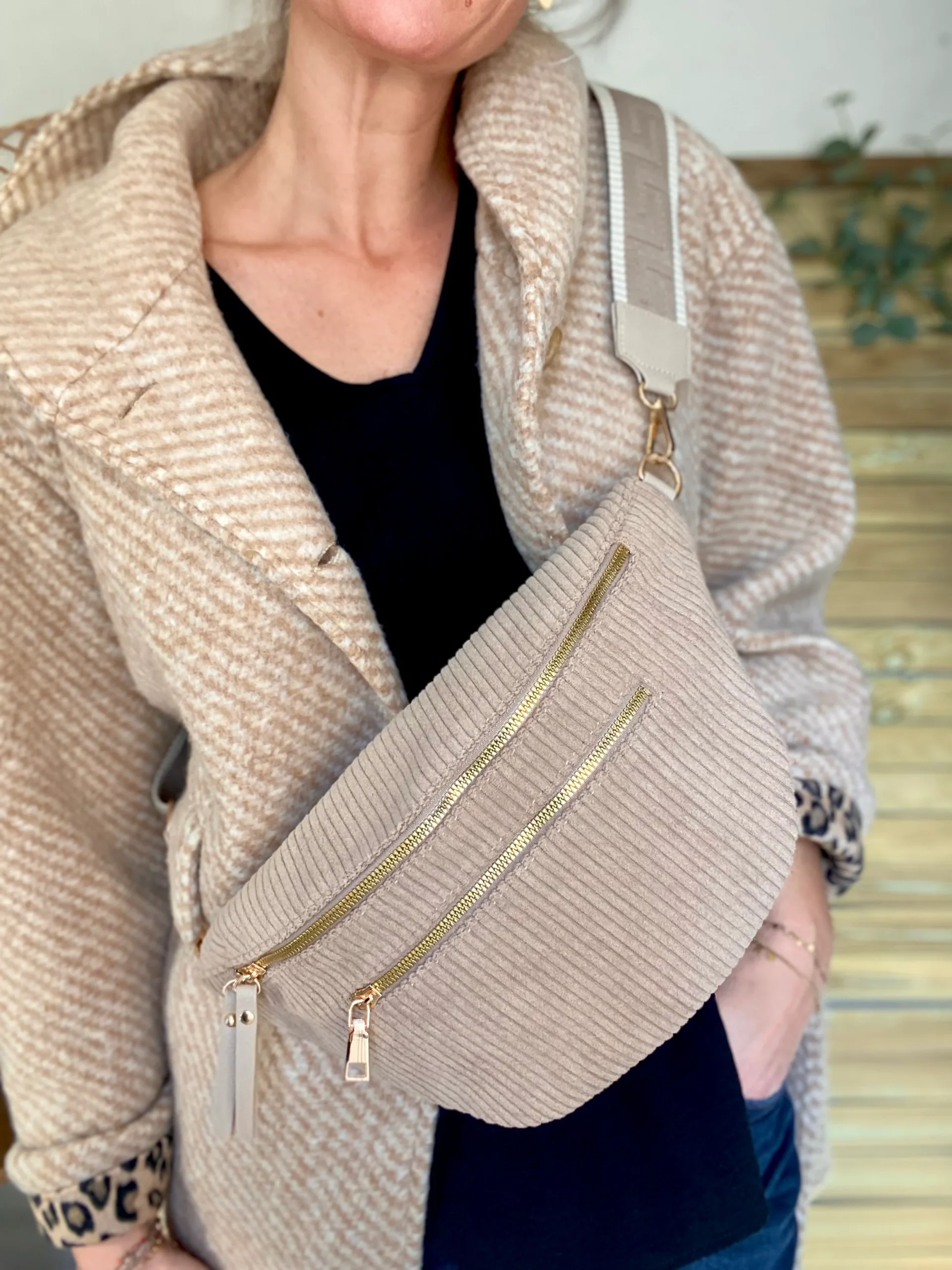 Sac banane XL en velours côtelé 2 zips et sangle fantaisie – WENDY – Taupe