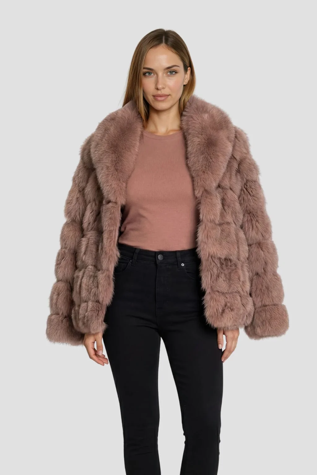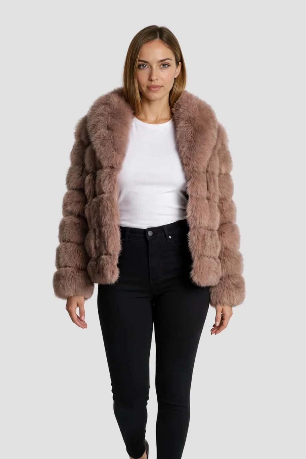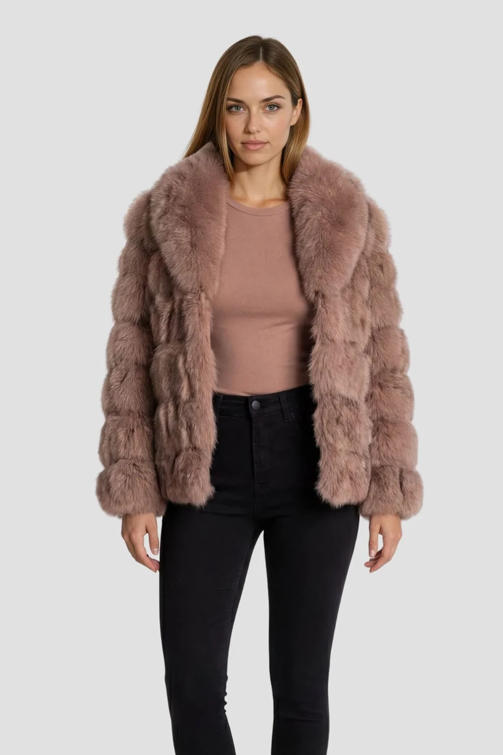 La veste fourrure femme rose est entièrement réalisée en fourrure, offrant une matière dense et enveloppante. Le col généreux en fourrure de renard, les finitions soignées et la construction précise assurent un porté élégant, structuré et durable.