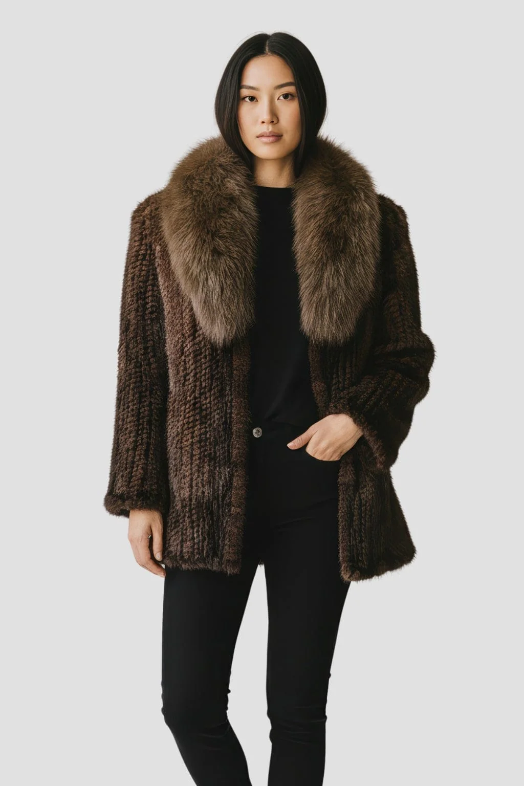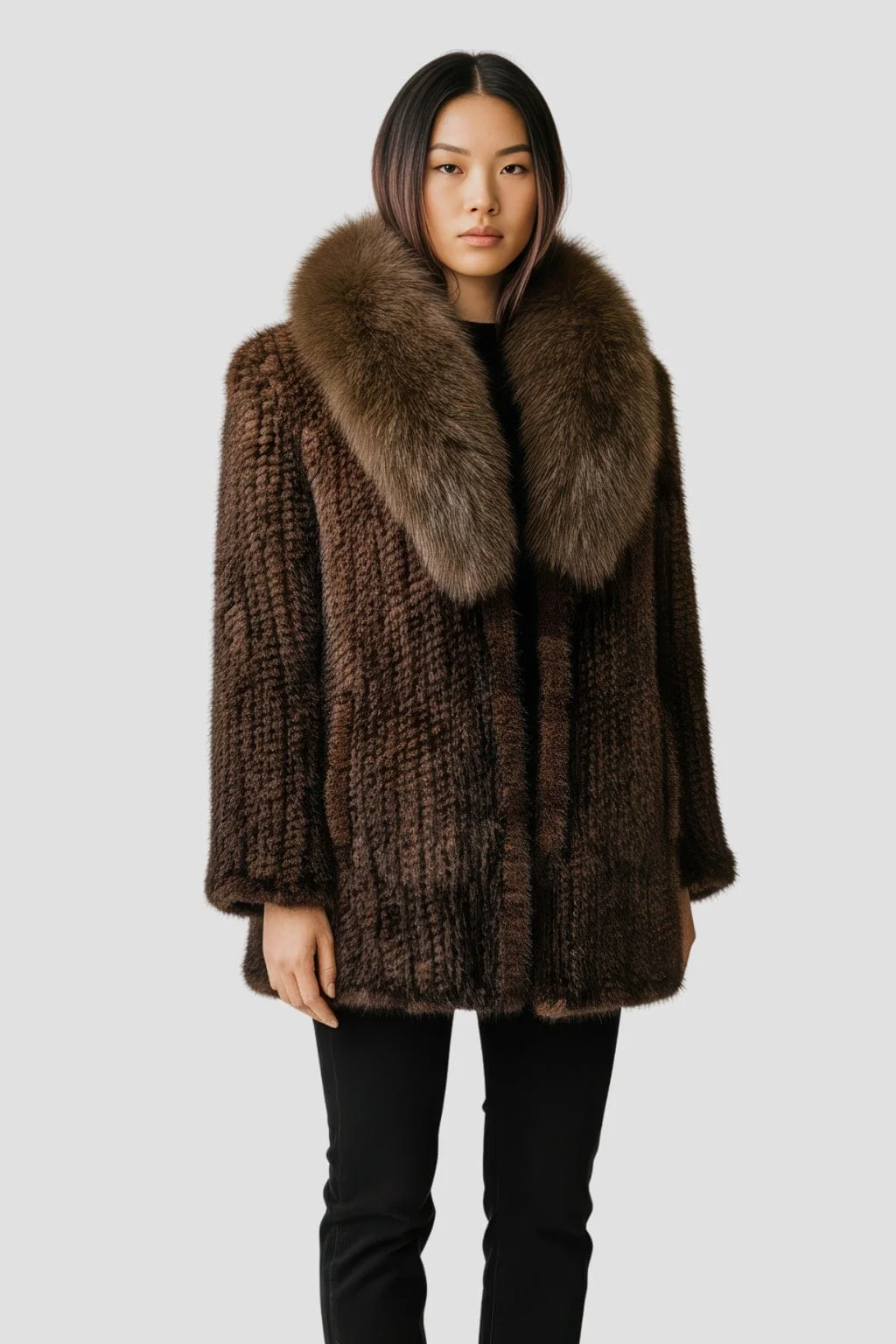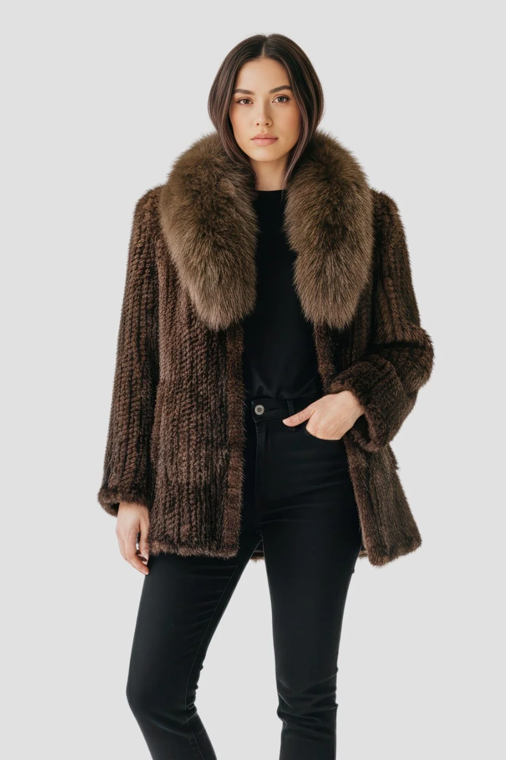Finitions main, boutonnières discrètes et bords parfaitement gansés soignent le rendu. La veste fourrure femme vison affirme ainsi un équilibre rare entre éclat et sobriété.