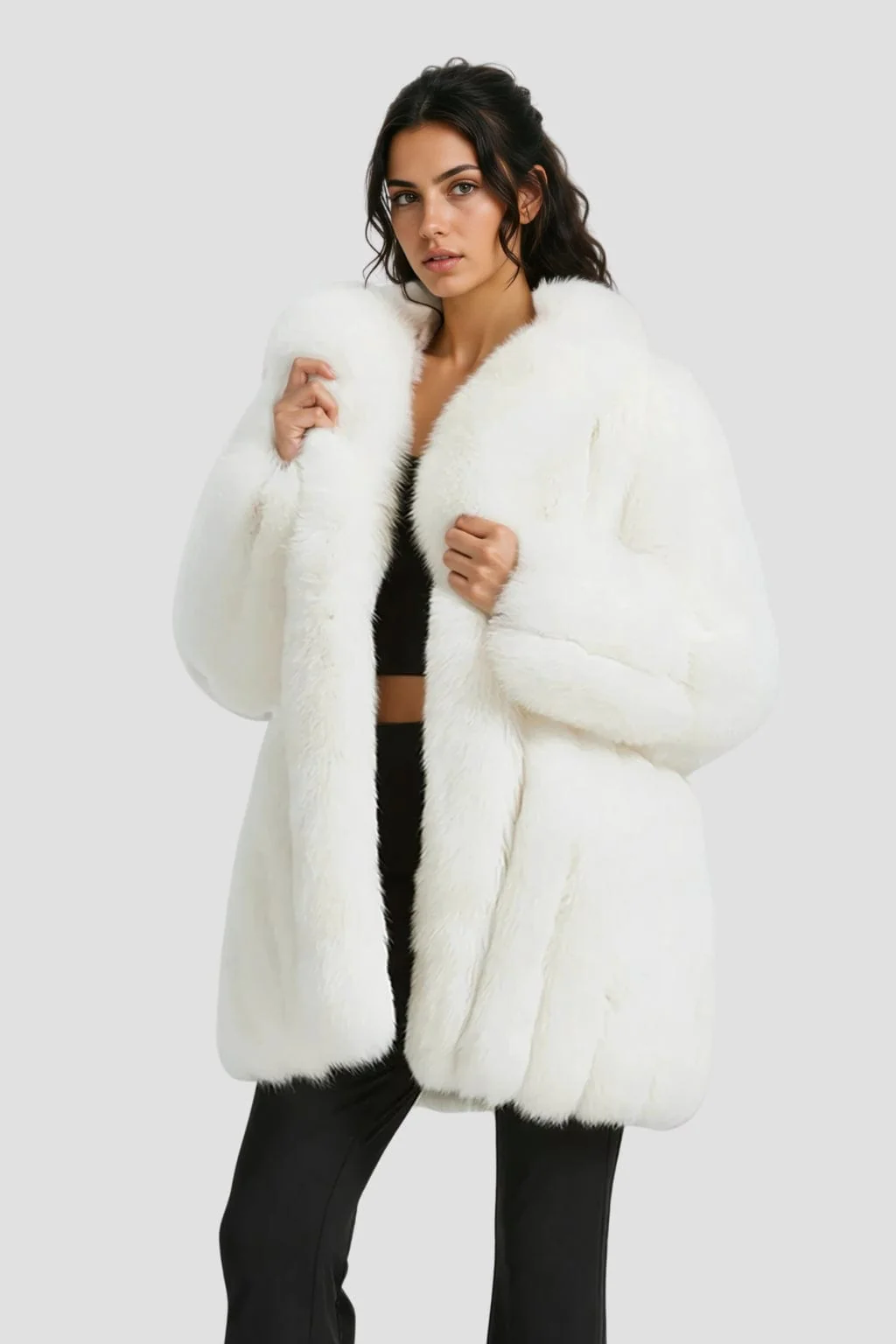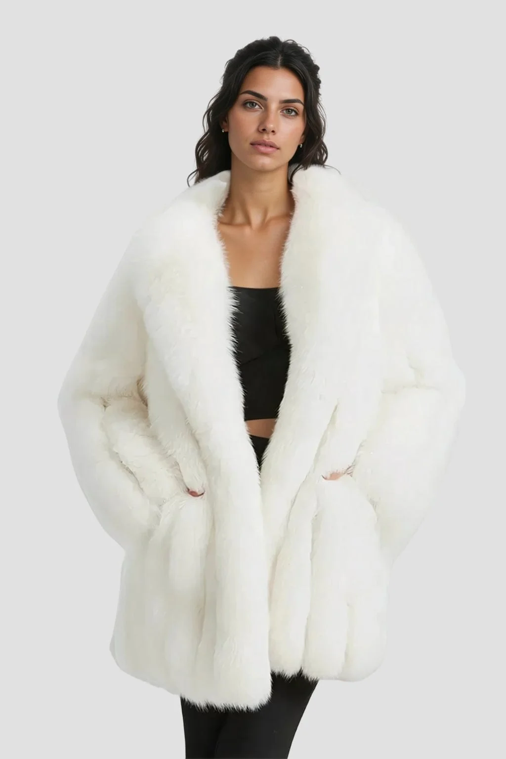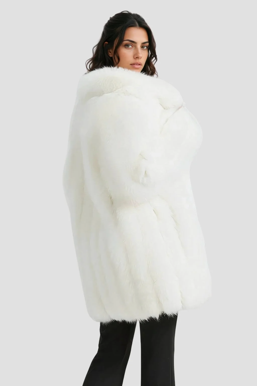 La veste longue en fourrure blanche exhale une pureté lumineuse