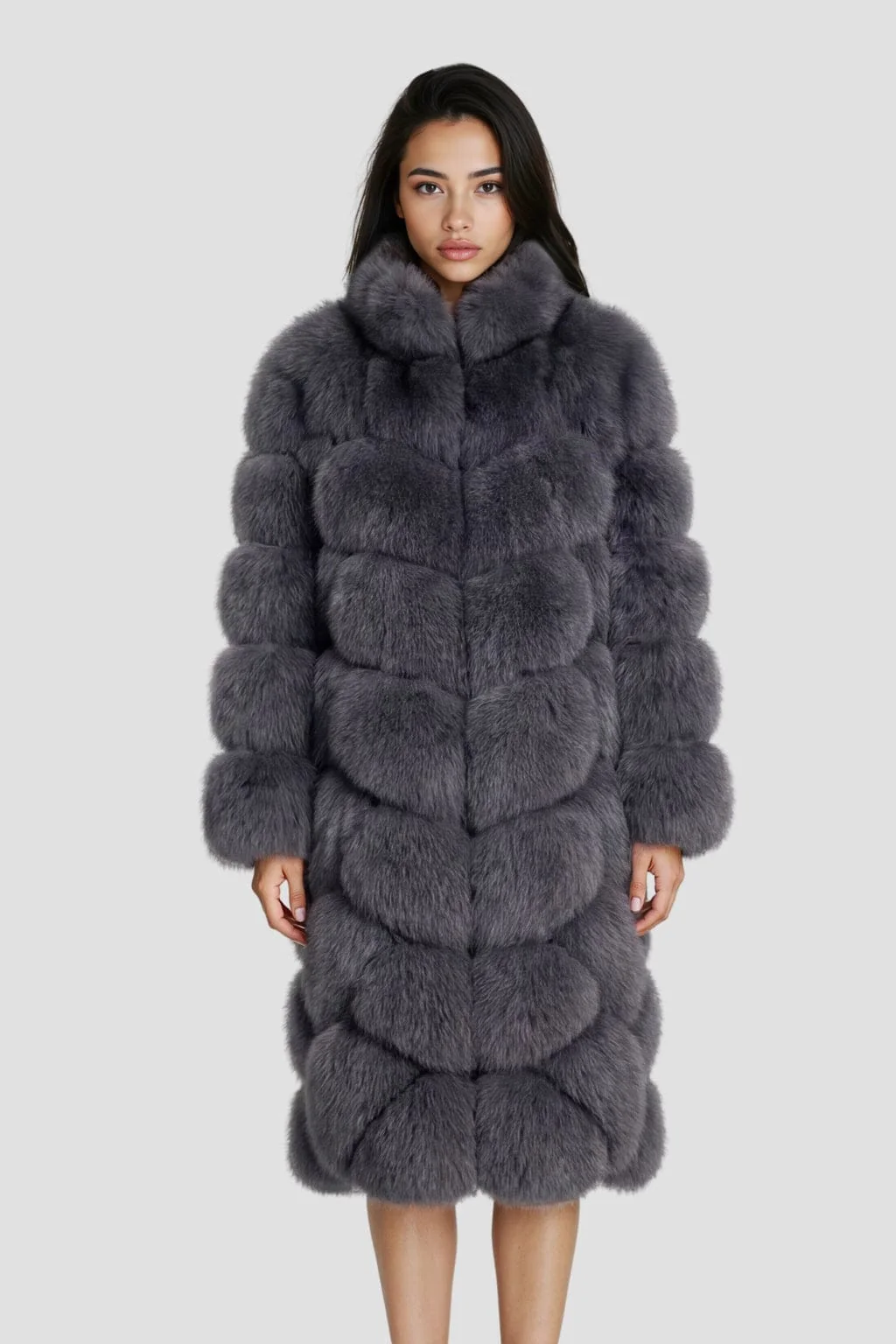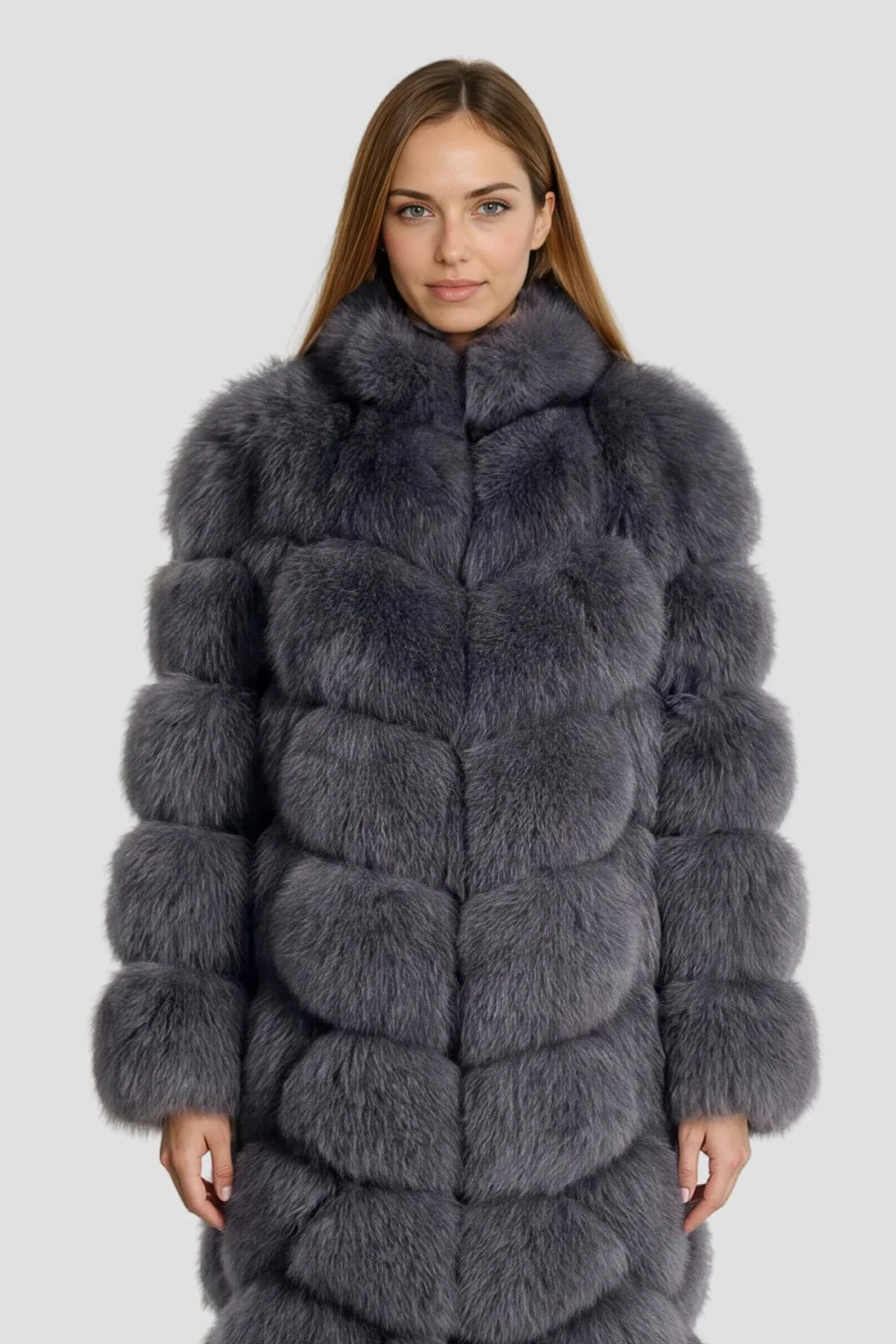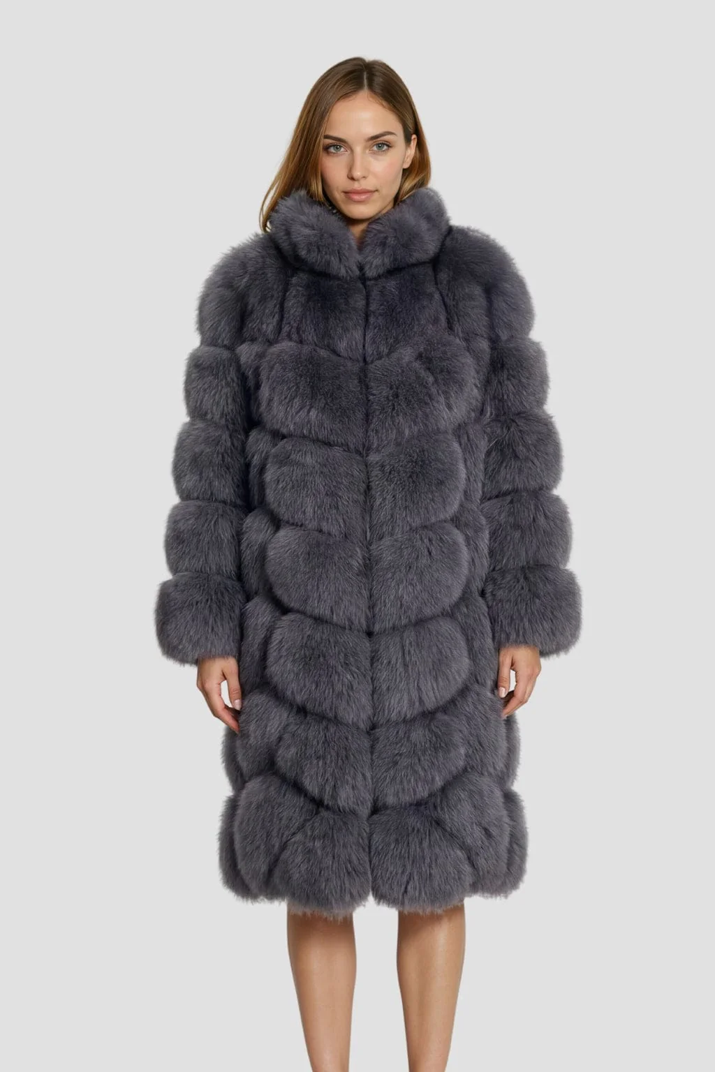 La veste longue en fourrure grise se démarque par son col en fourrure gris harmonieux ; La coupe étudiée souligne la taille et confère au porté une présence maîtrisée, à la fois raffinée et chaleureuse.